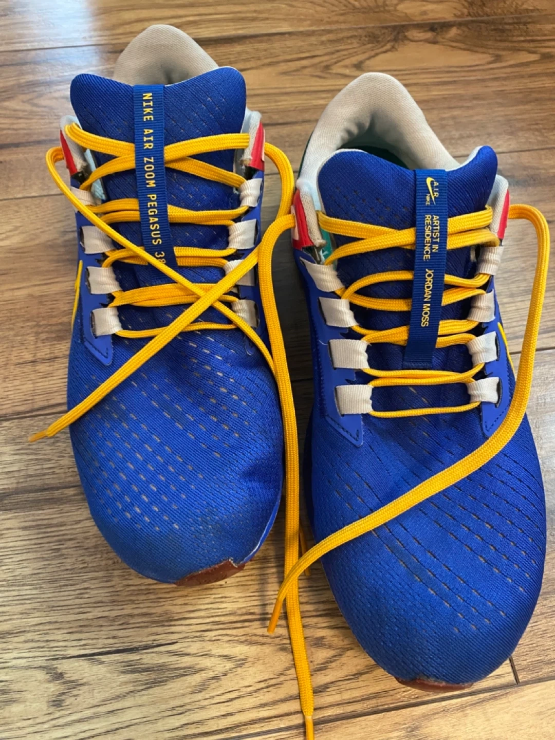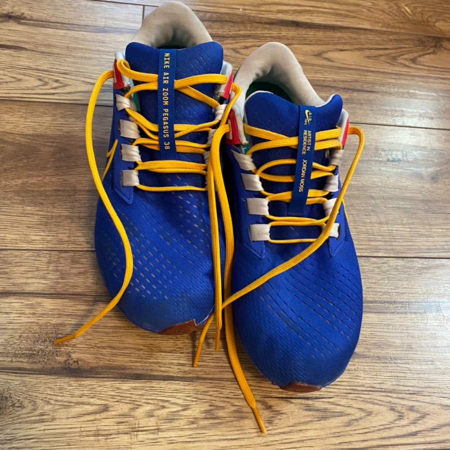 60Selling a pair of Nike Air Zoom Pegasus 38 Artist In Residence Jordan Moss edition sneakers! These are in great shape and ready for a new home. The vibrant blue colourway with yellow laces really pops!