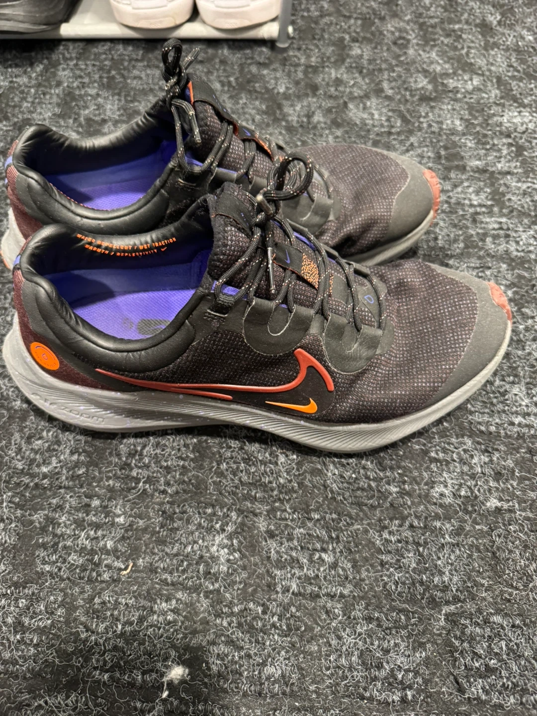 62Selling a pair of Nike Air Zoom running shoes. They're in great shape and ready for your next run! The shoes feature a sleek design with a dark grey and orange colour scheme. The soles have good tread, ensuring reliable grip.