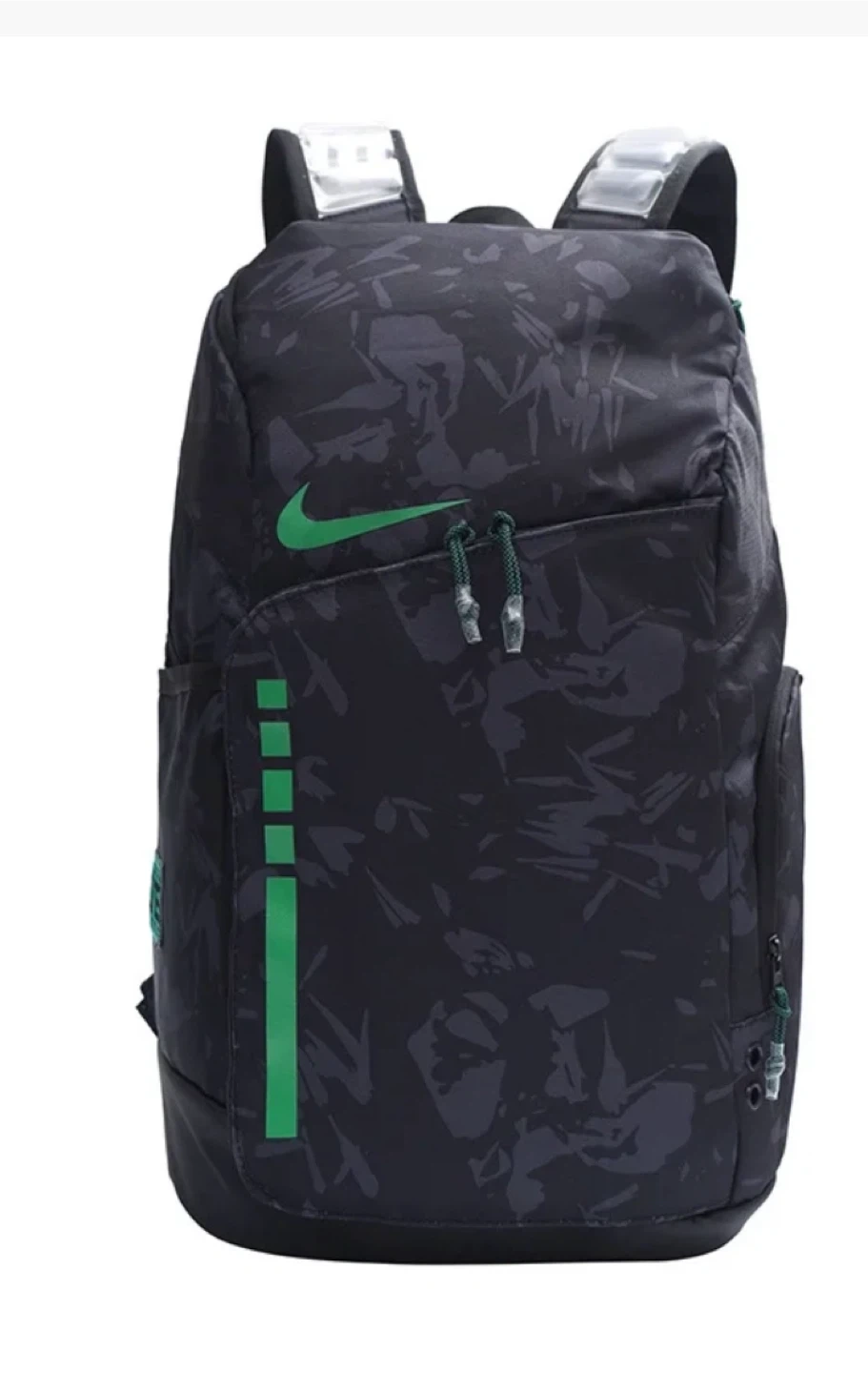 This is a Nike backpack in black with green accents. It features the Nike swoosh logo and a unique pattern. Perfect for school, sports, or everyday use!