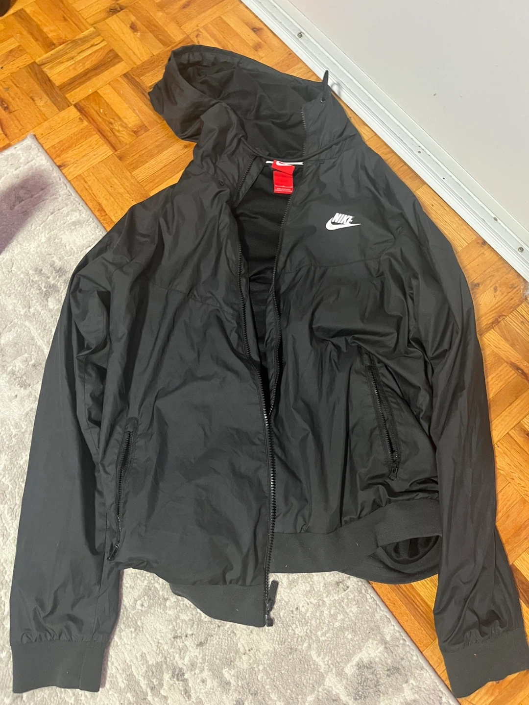 Selling a black Nike windbreaker jacket! It's in great condition and perfect for layering or wearing on a windy day. The jacket features the classic Nike swoosh logo and a comfortable, lightweight design.