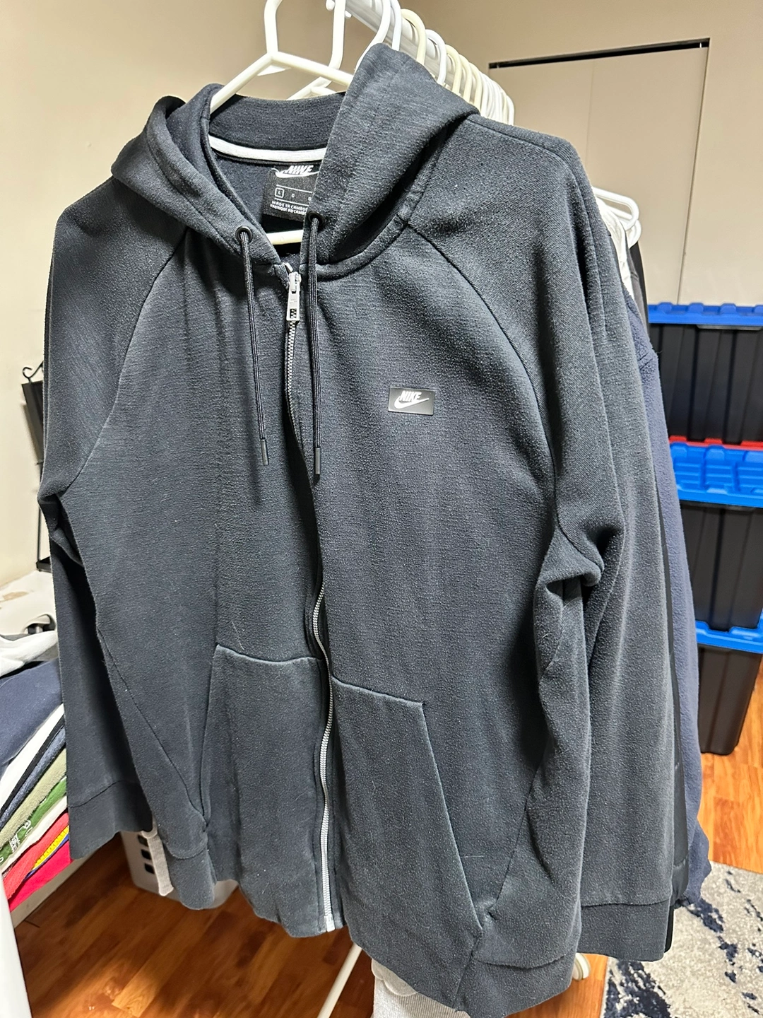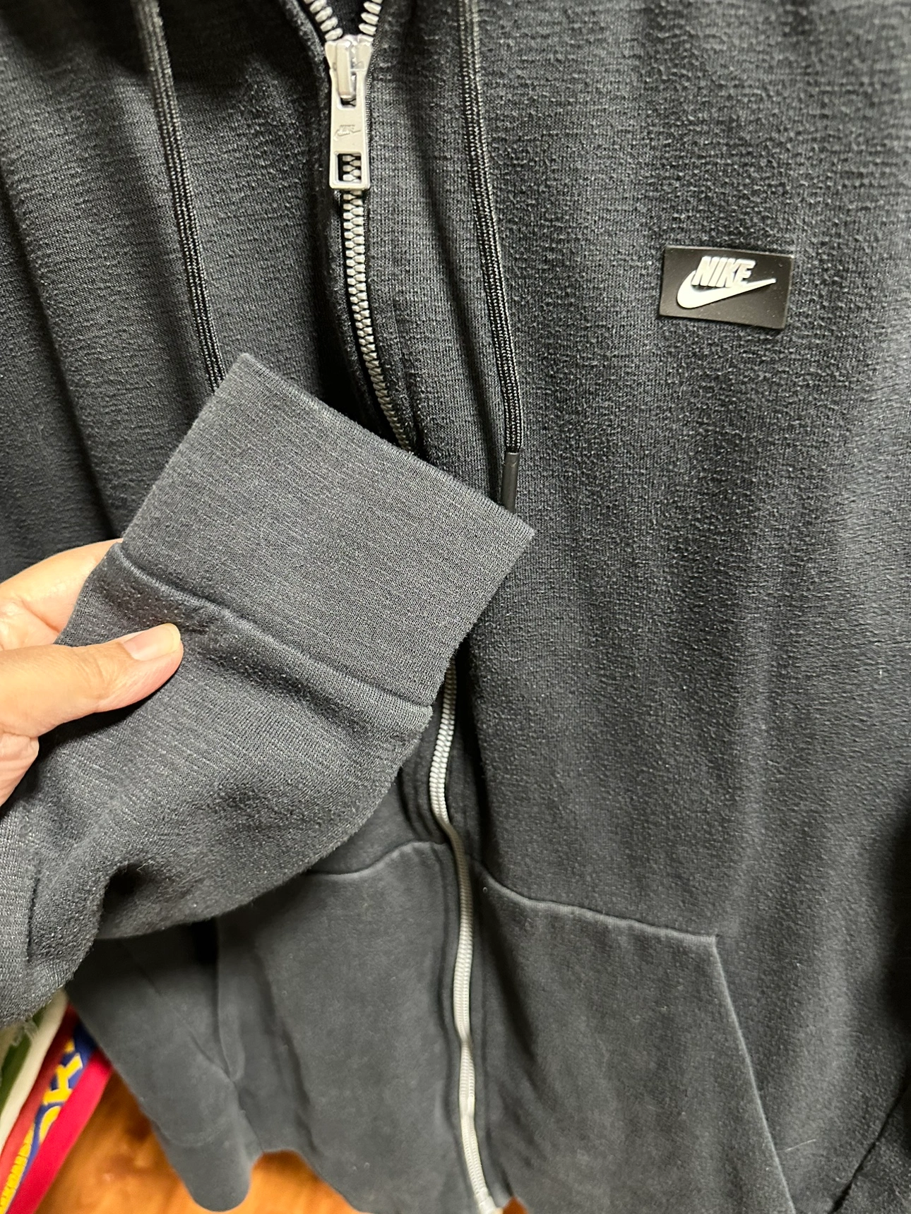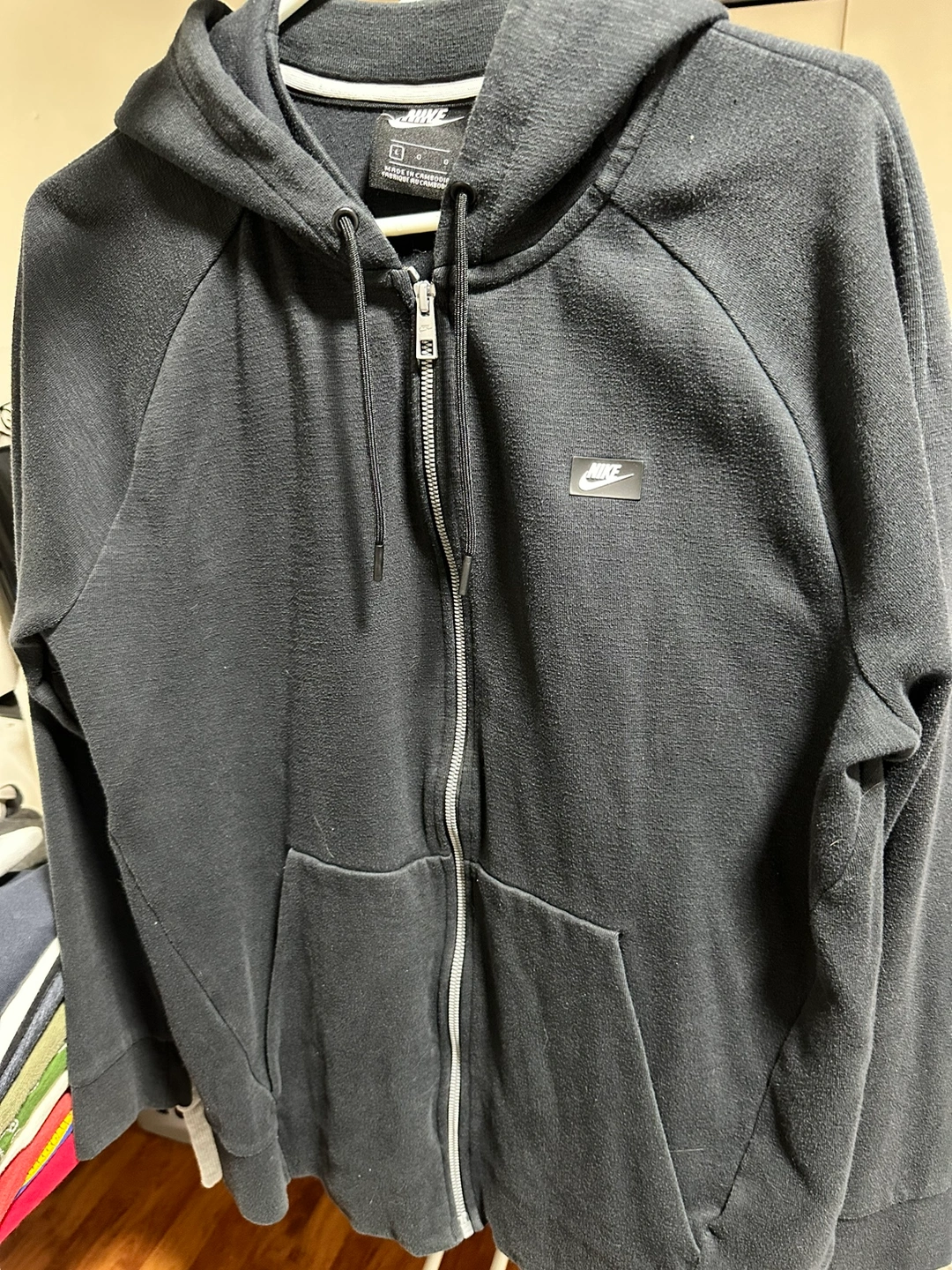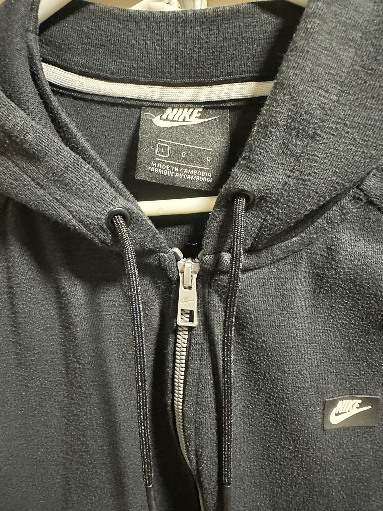 17Black Nike zip-up hoodie with a small Nike logo on the front. The hoodie is size Large. The hood has a drawstring. The sleeves are long with a ribbed cuff. The hoodie has a zipper closure.