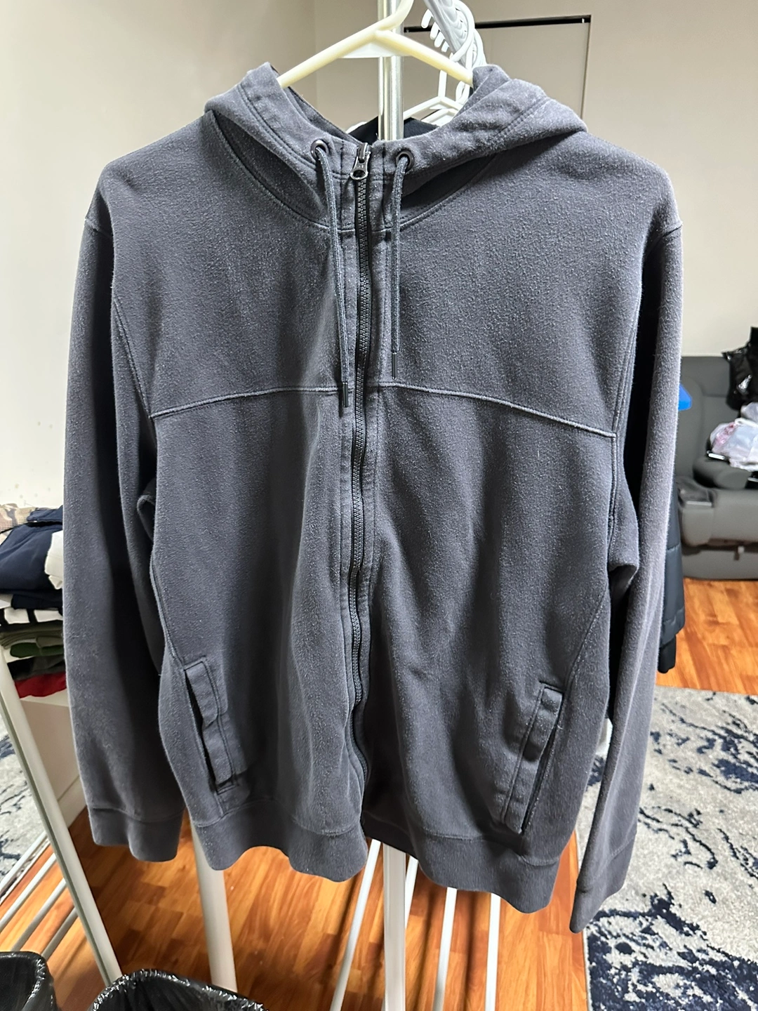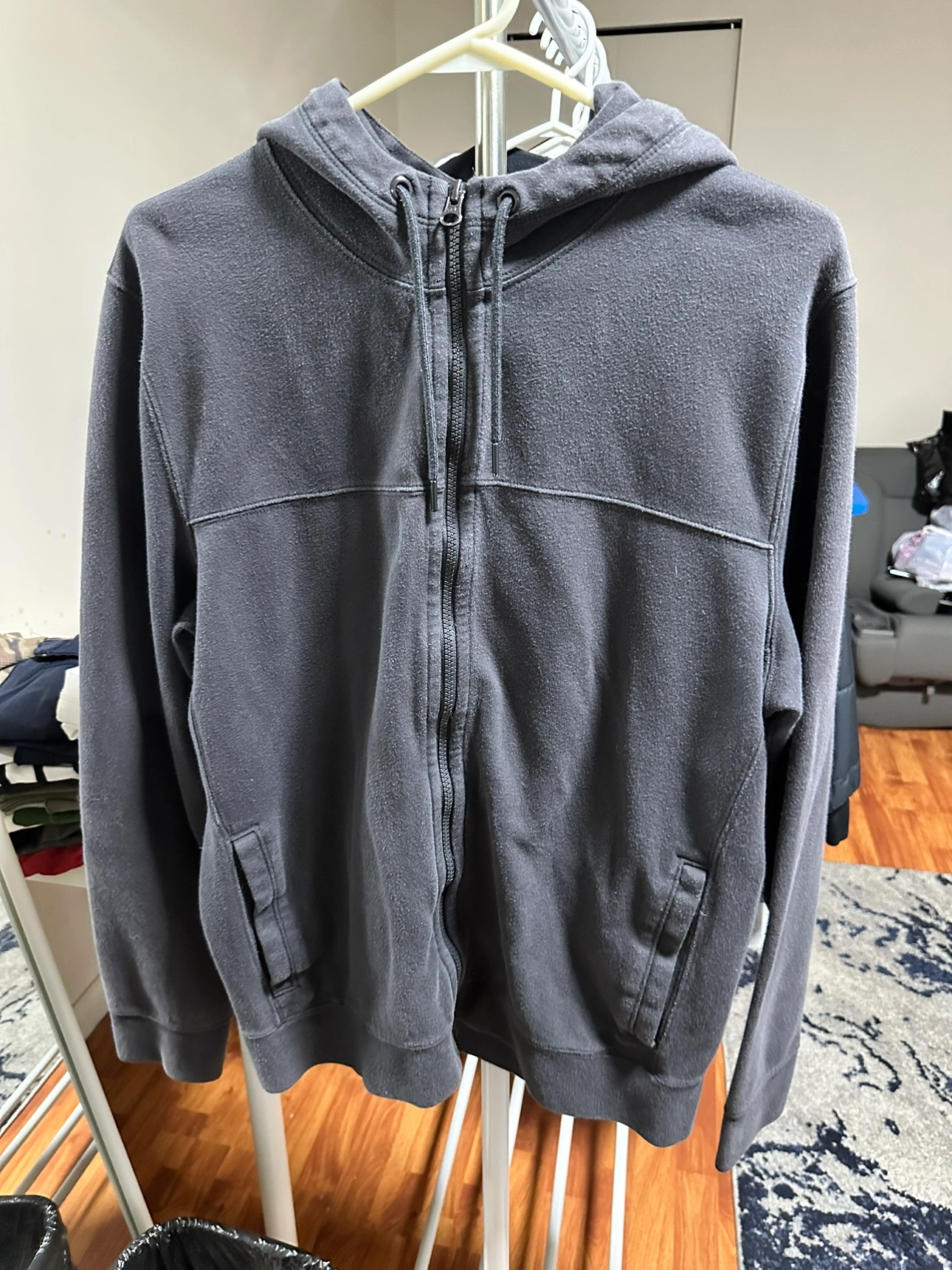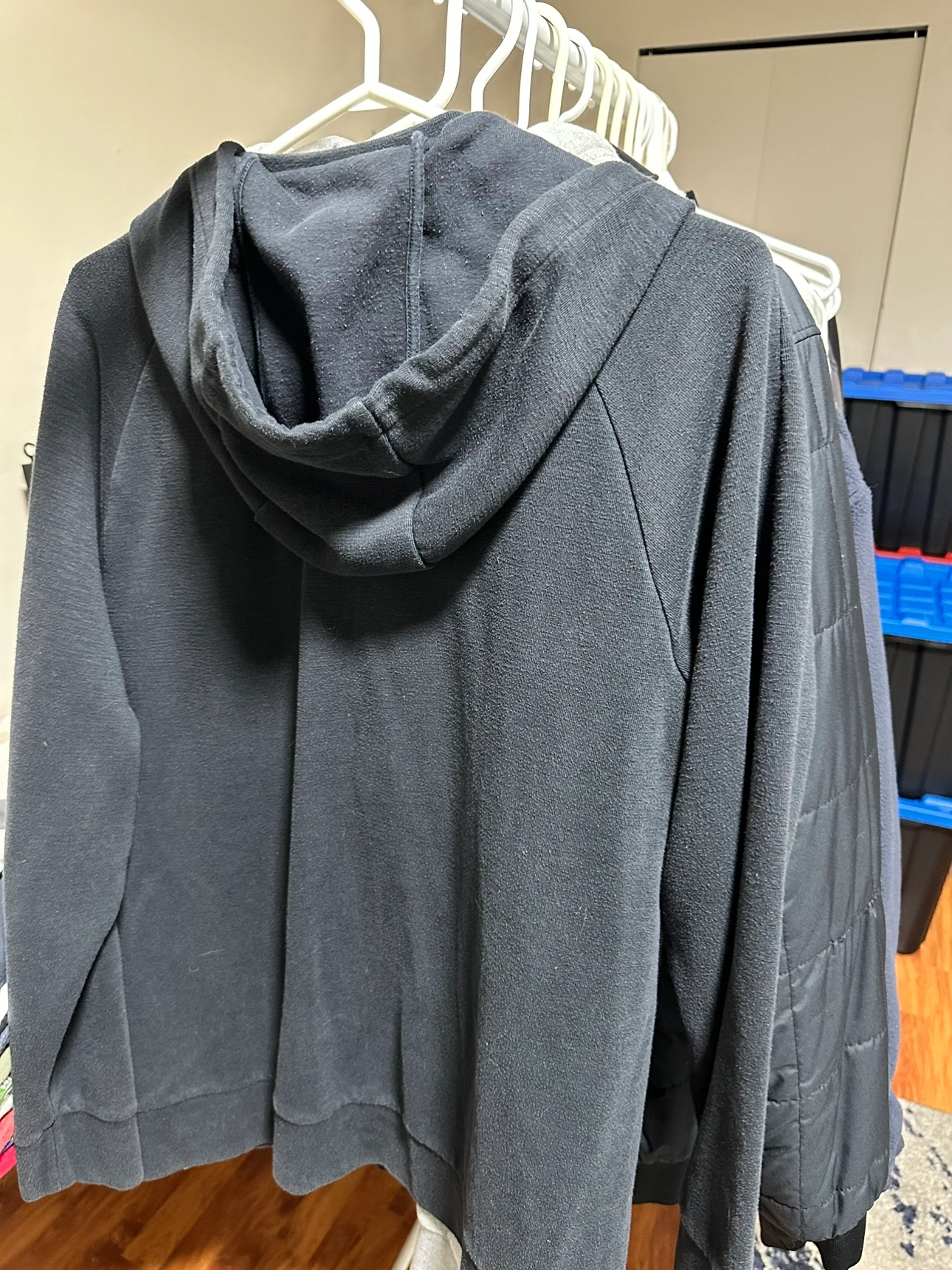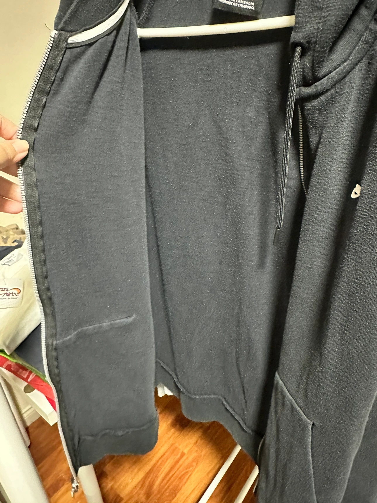 17Black Nike zip-up hoodie with a small Nike logo on the front. The hoodie is size Large. The hood has a drawstring. The sleeves are long with a ribbed cuff. The hoodie has a zipper closure.