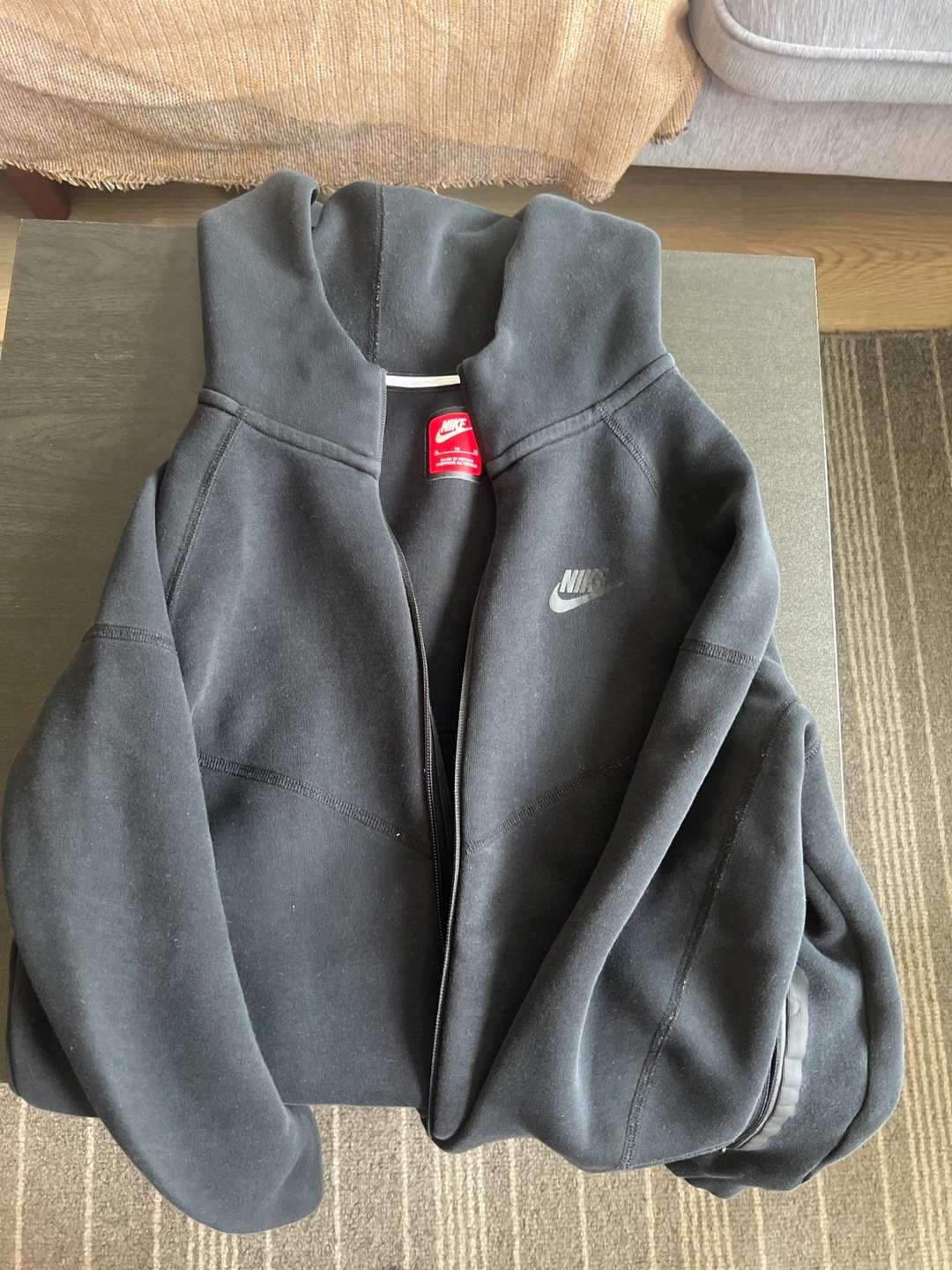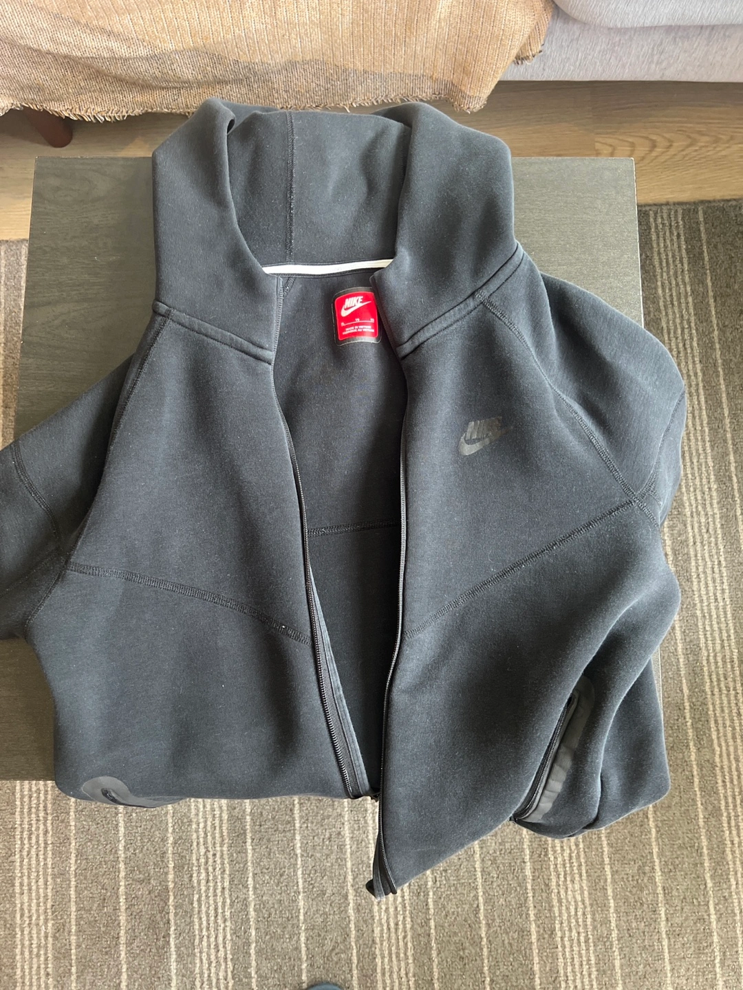 A black zip-up hoodie. Made with what appears to be a soft material. Features a high collar and a logo on the chest. Ideal for a relaxing day at home.