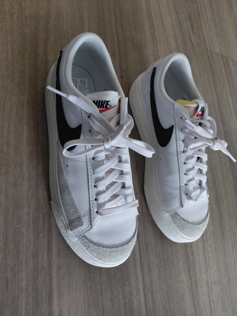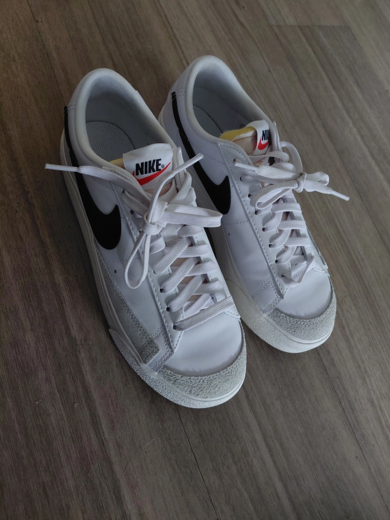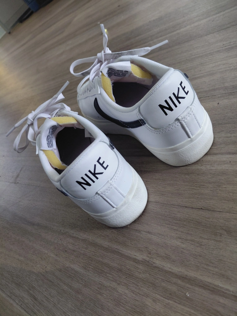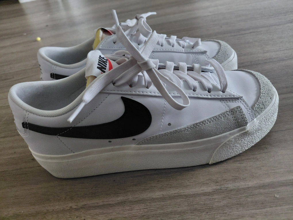 Selling a pair of Nike Blazer Low Platform sneakers in white! They feature the iconic black swoosh and a stylish low-cut design. A great addition to any wardrobe!