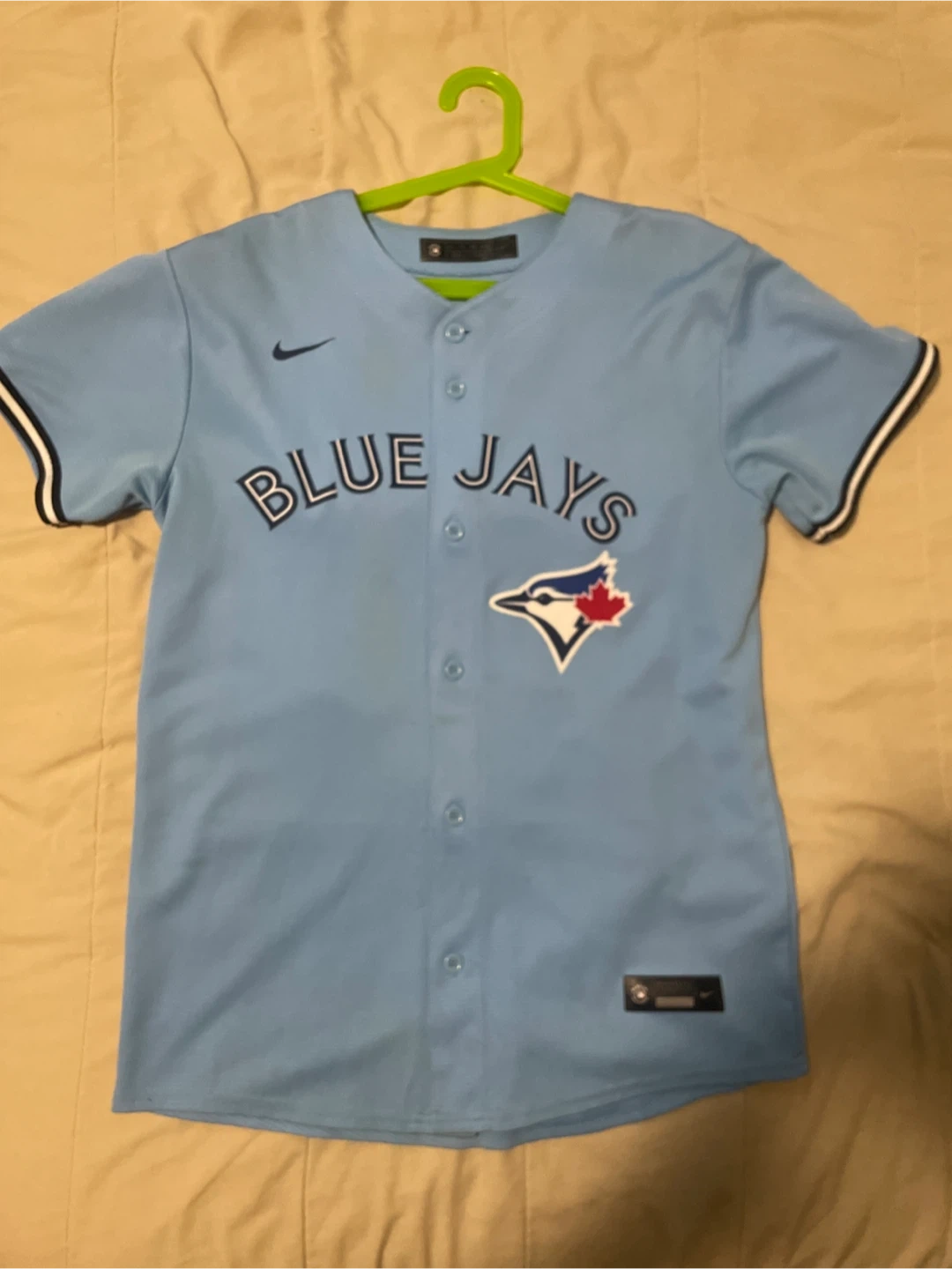 Show your support for the Toronto Blue Jays with this light blue Nike jersey featuring Guerrero Jr. It's perfect for any Jays fan. Small stain in middle hardly noticeable.