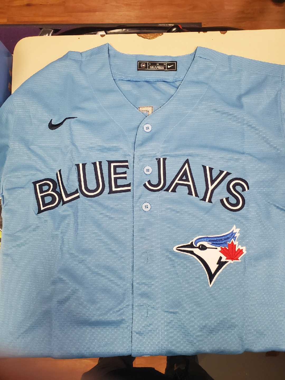 Selling a Blue Jays jersey in excellent condition! It's a size XL and made by Nike. The jersey features the Blue Jays logo and the iconic Nike swoosh. Perfect for showing your team spirit!
