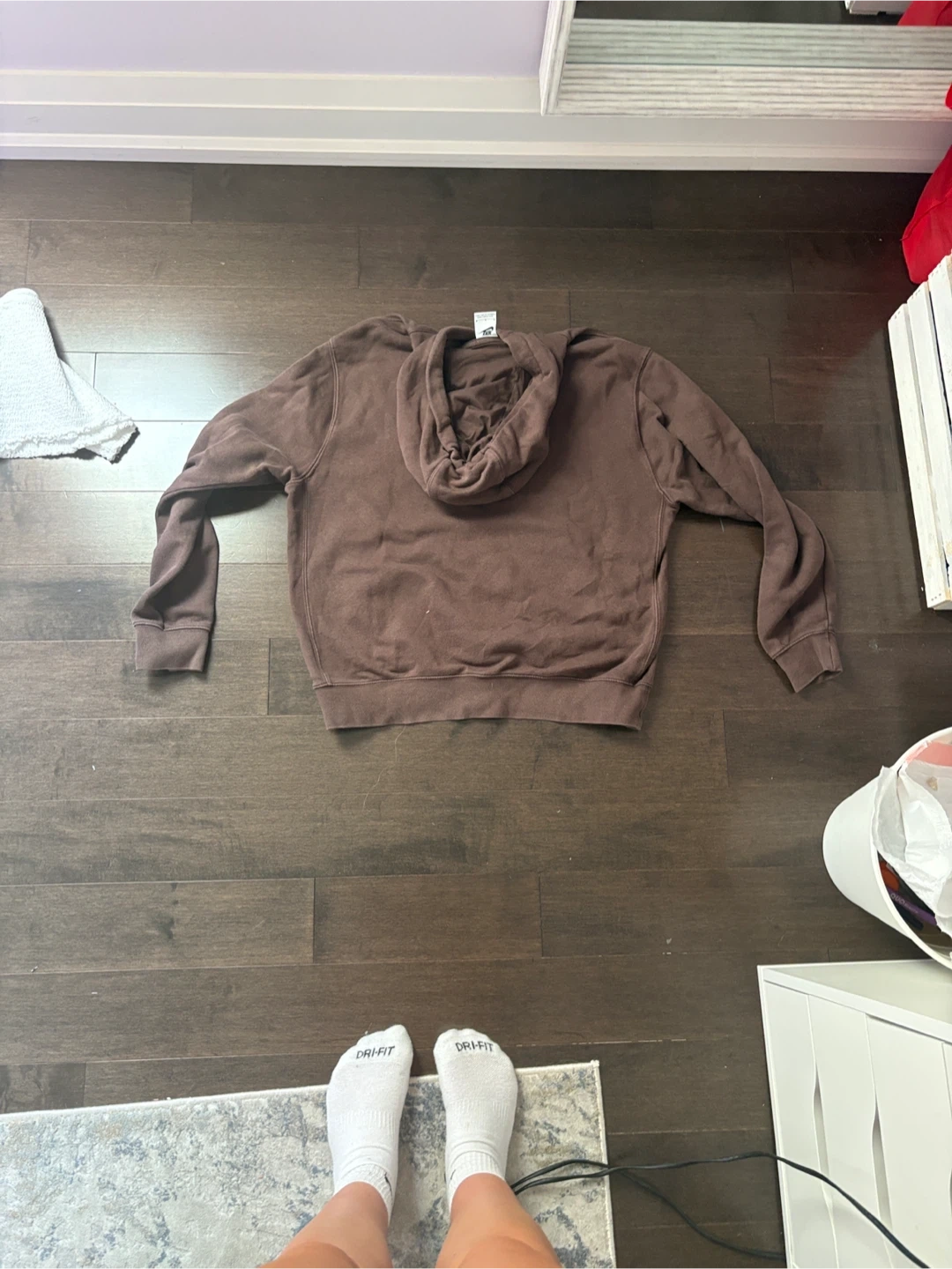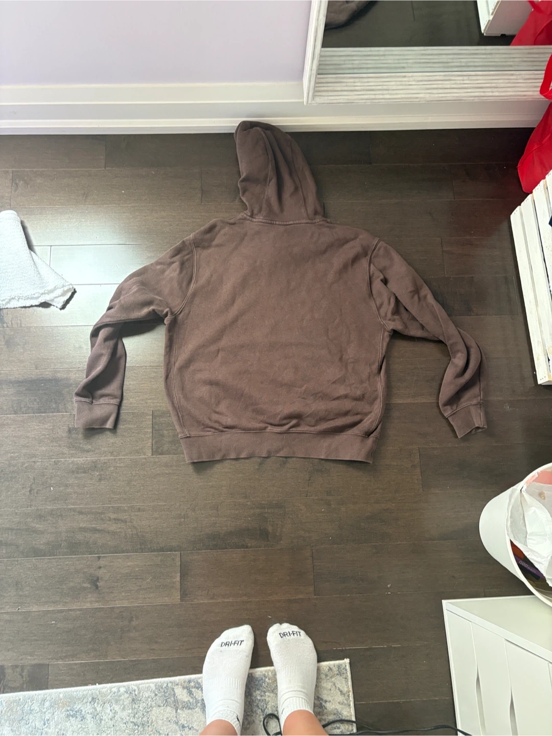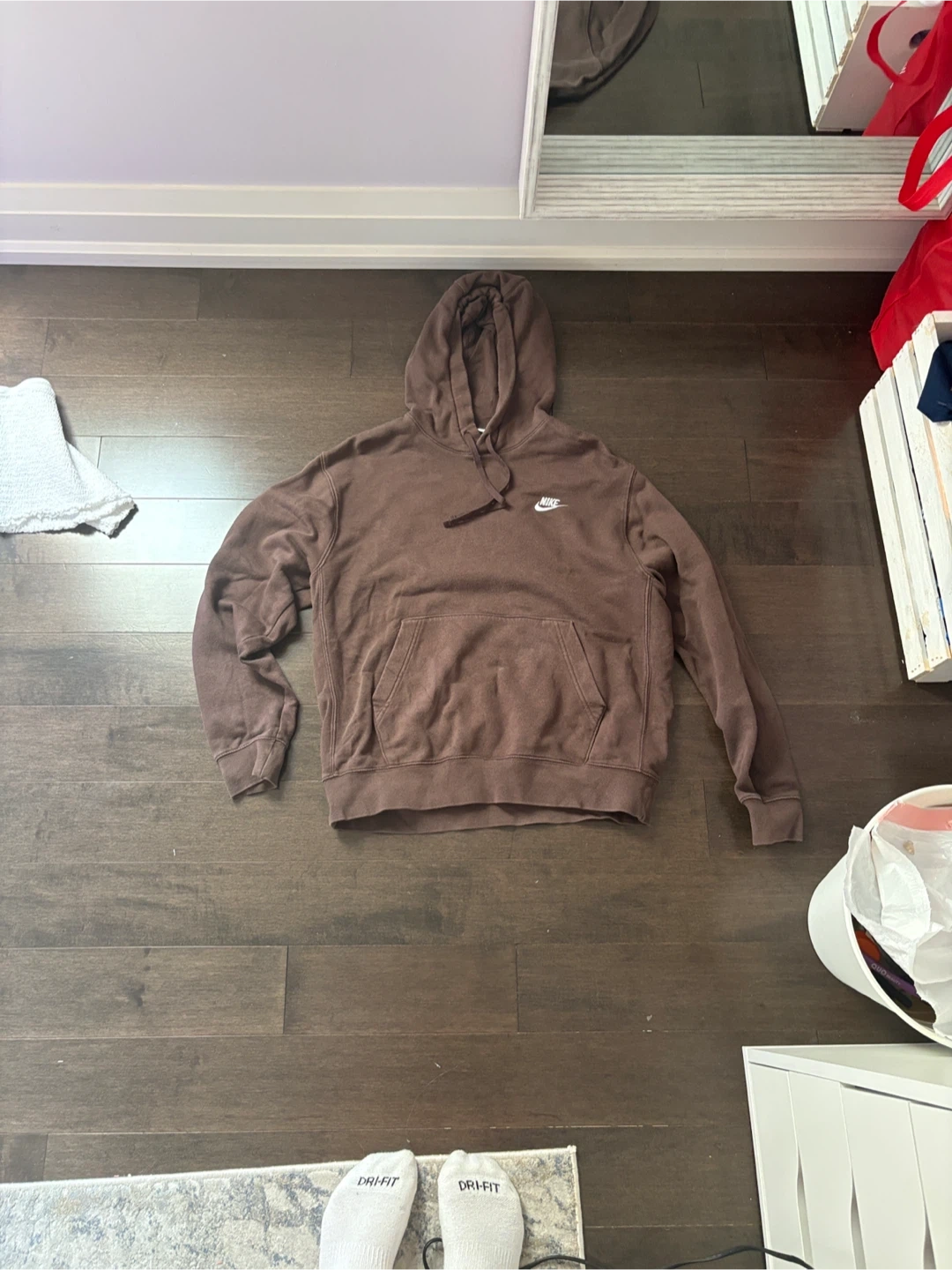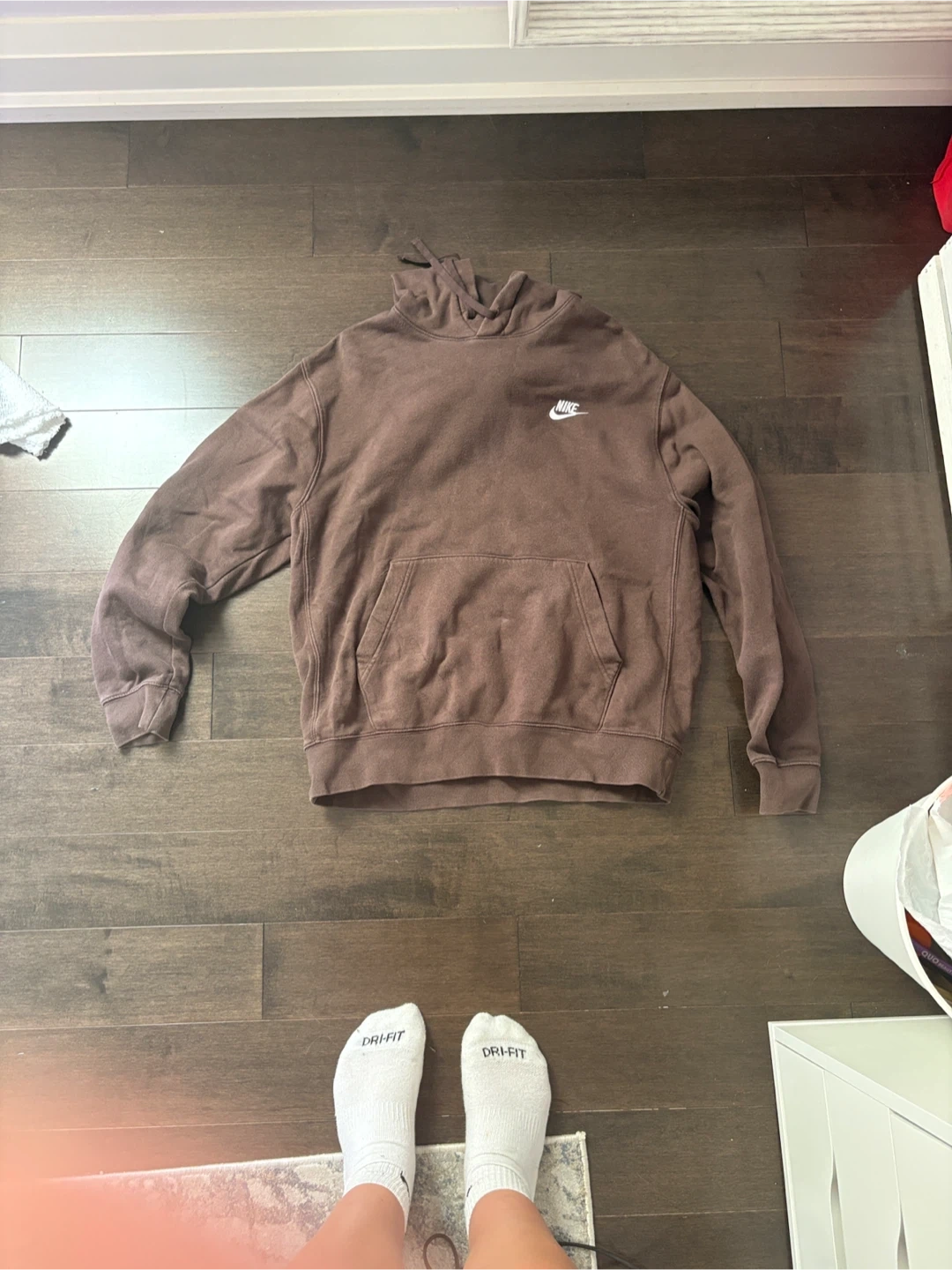 Selling a comfy brown Nike hoodie. It's in great condition and ready for a new home! The hoodie features a classic design with a hood and a front pocket. Perfect for staying cozy on cooler days