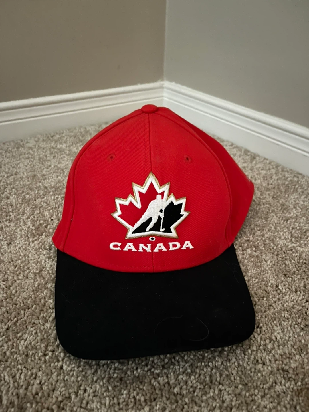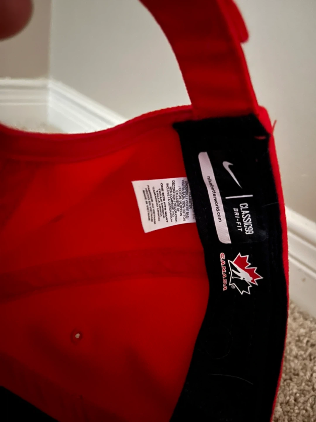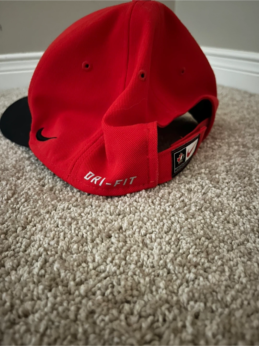 Selling a Nike Canada hat in red and black. It features the Canada logo on the front and Nike's Dri-FIT technology to keep you cool and comfortable. A stylish way to show your Canadian pride!