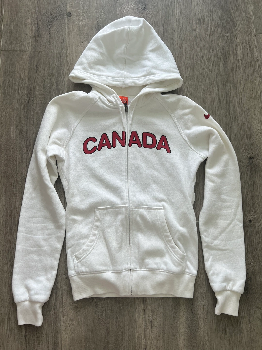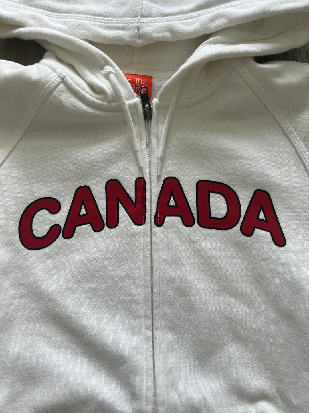 170White sweat jacket with red Canada logo. Full zip closure, pockets.