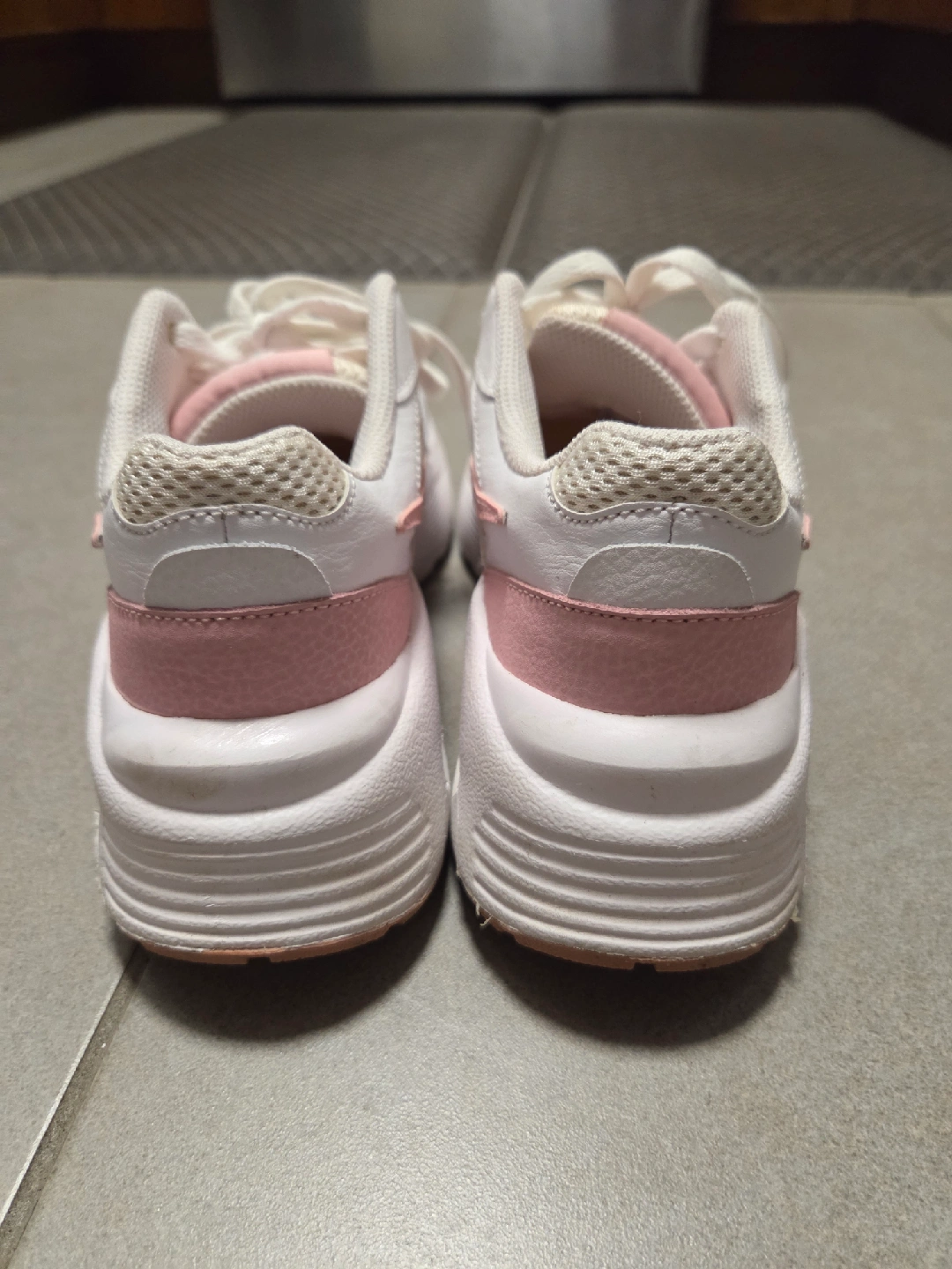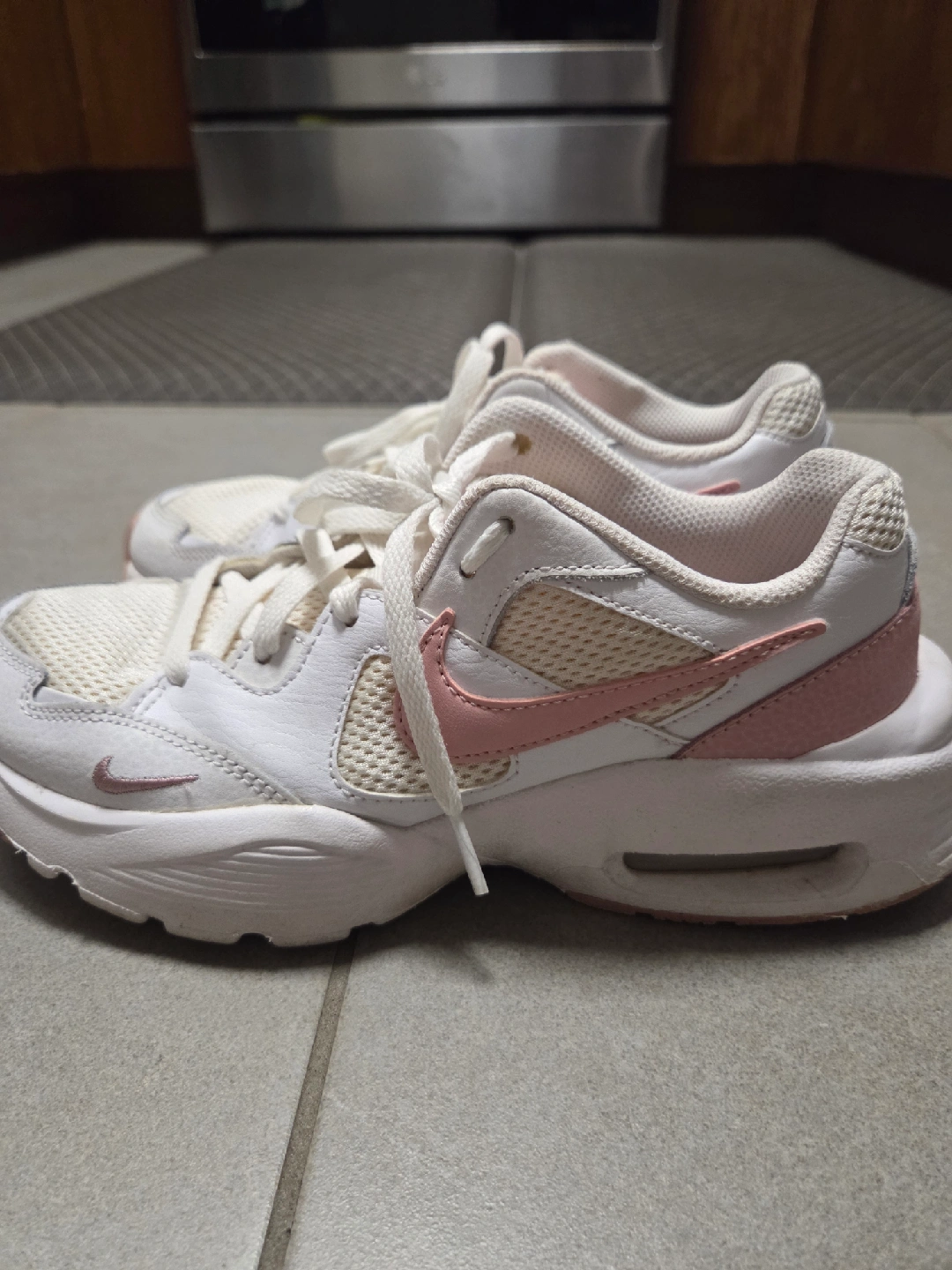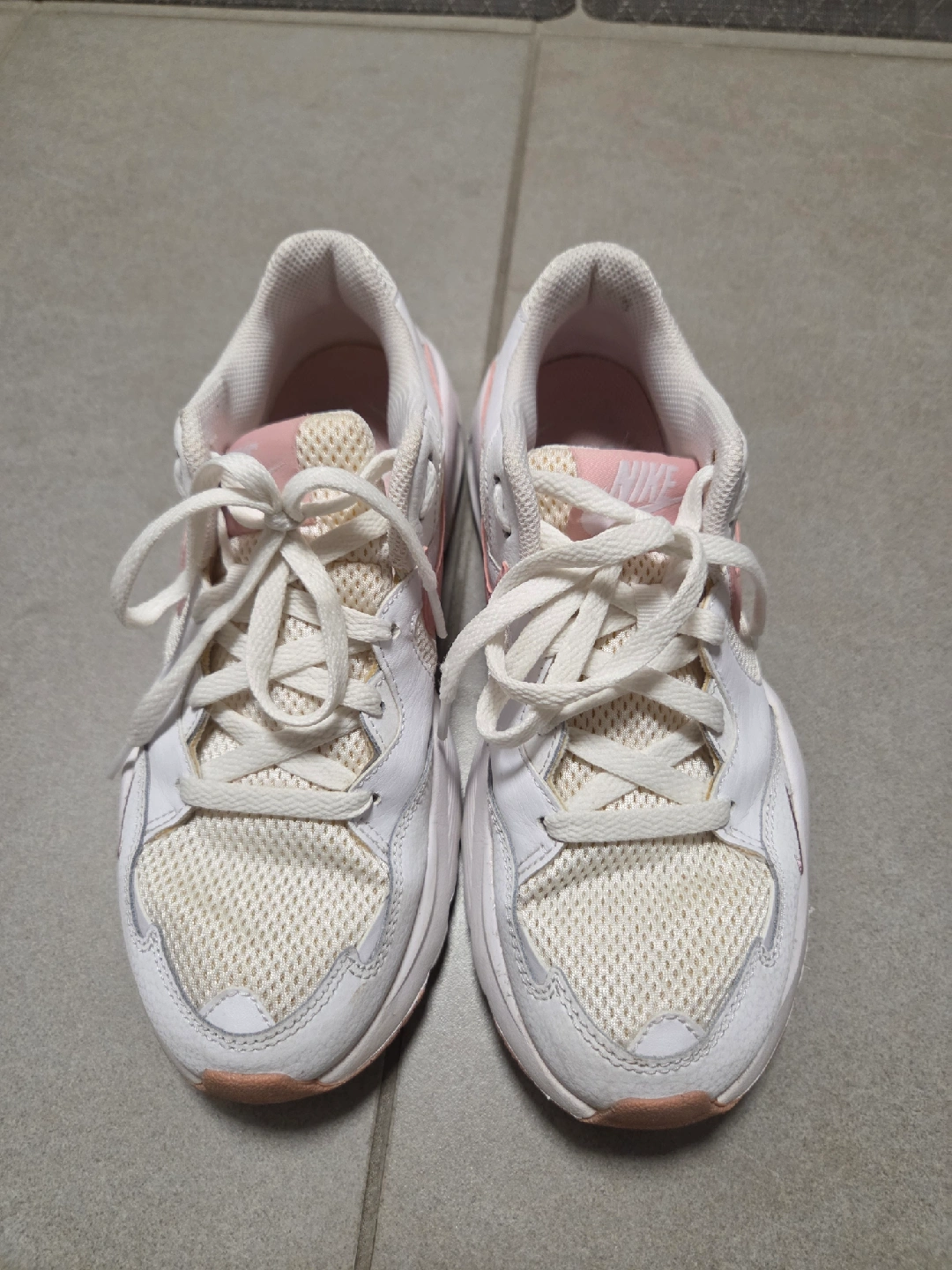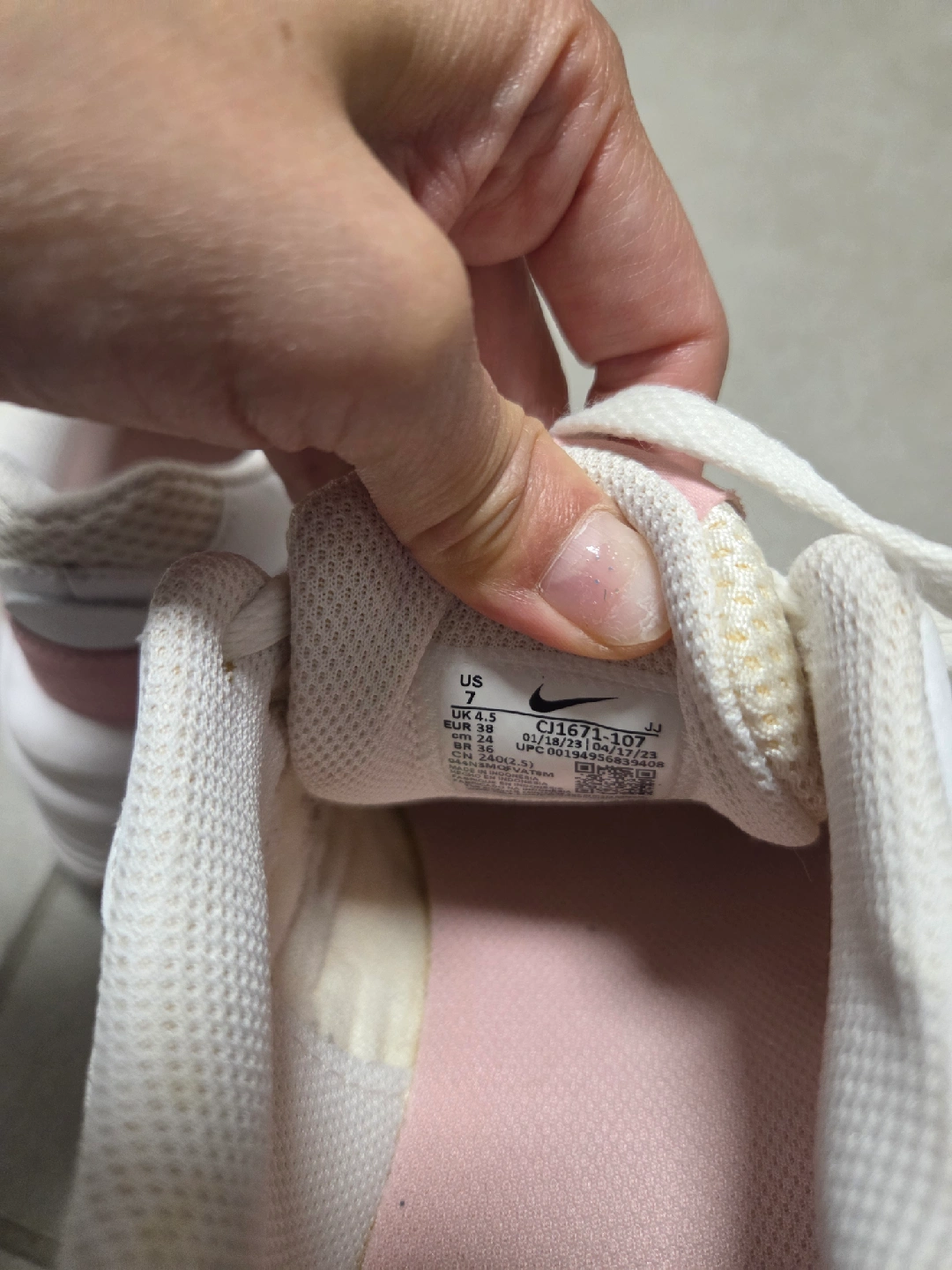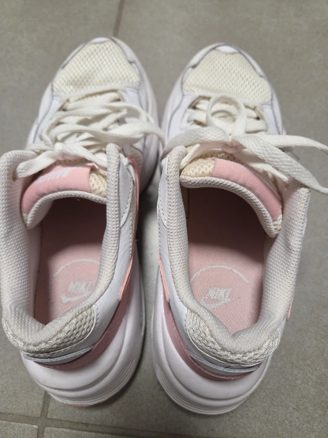 60Selling a pair of Nike sneakers. They are white with pink accents and in US size 7. These shoes have a sporty look and would be great for casual wear or light workouts!