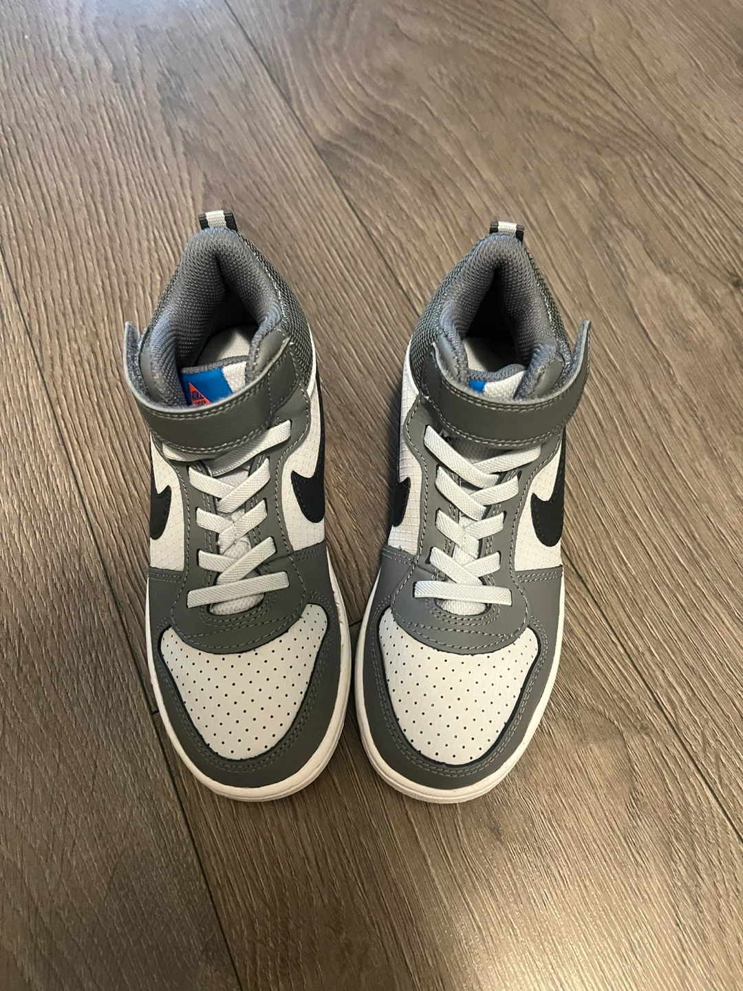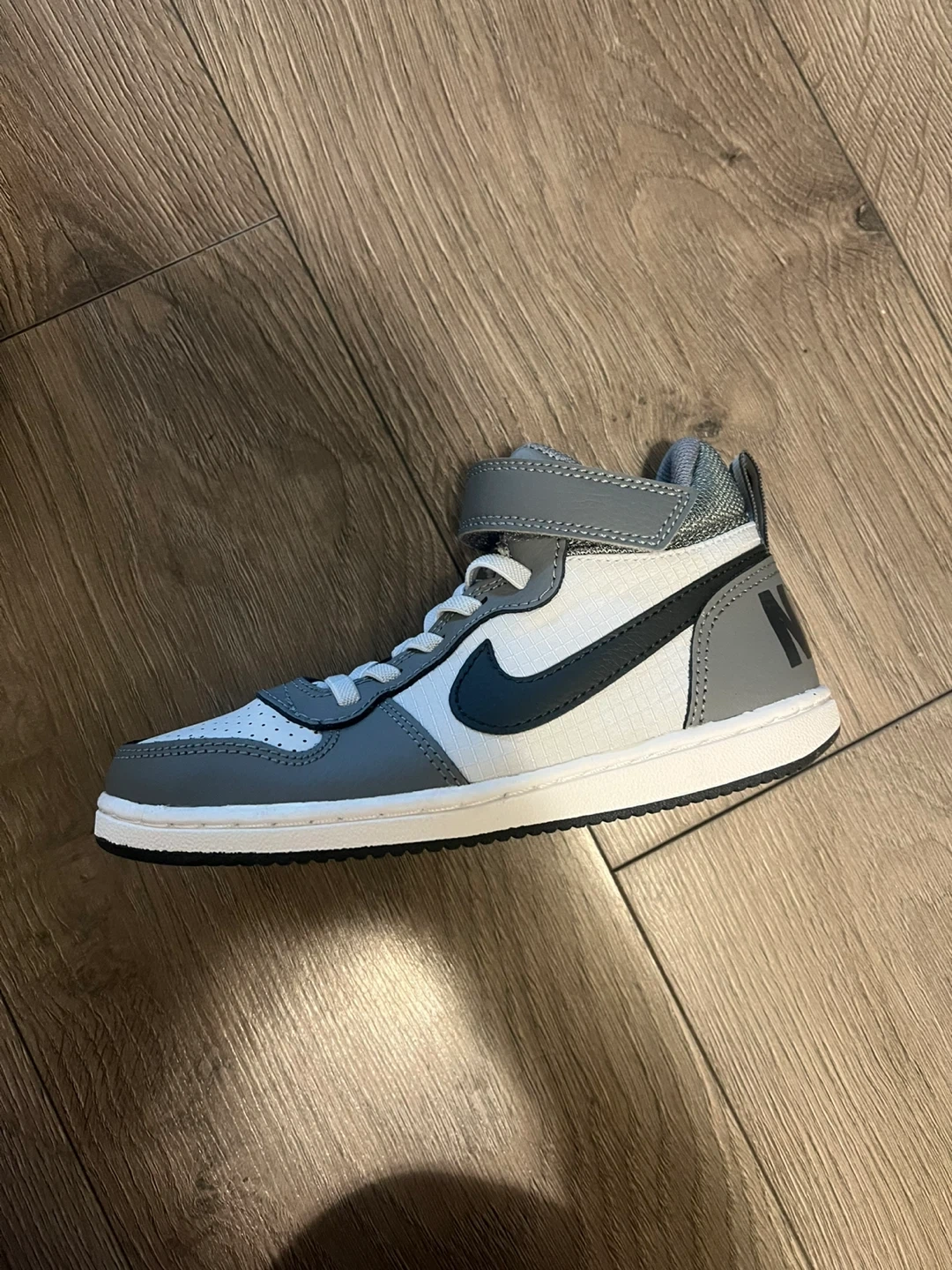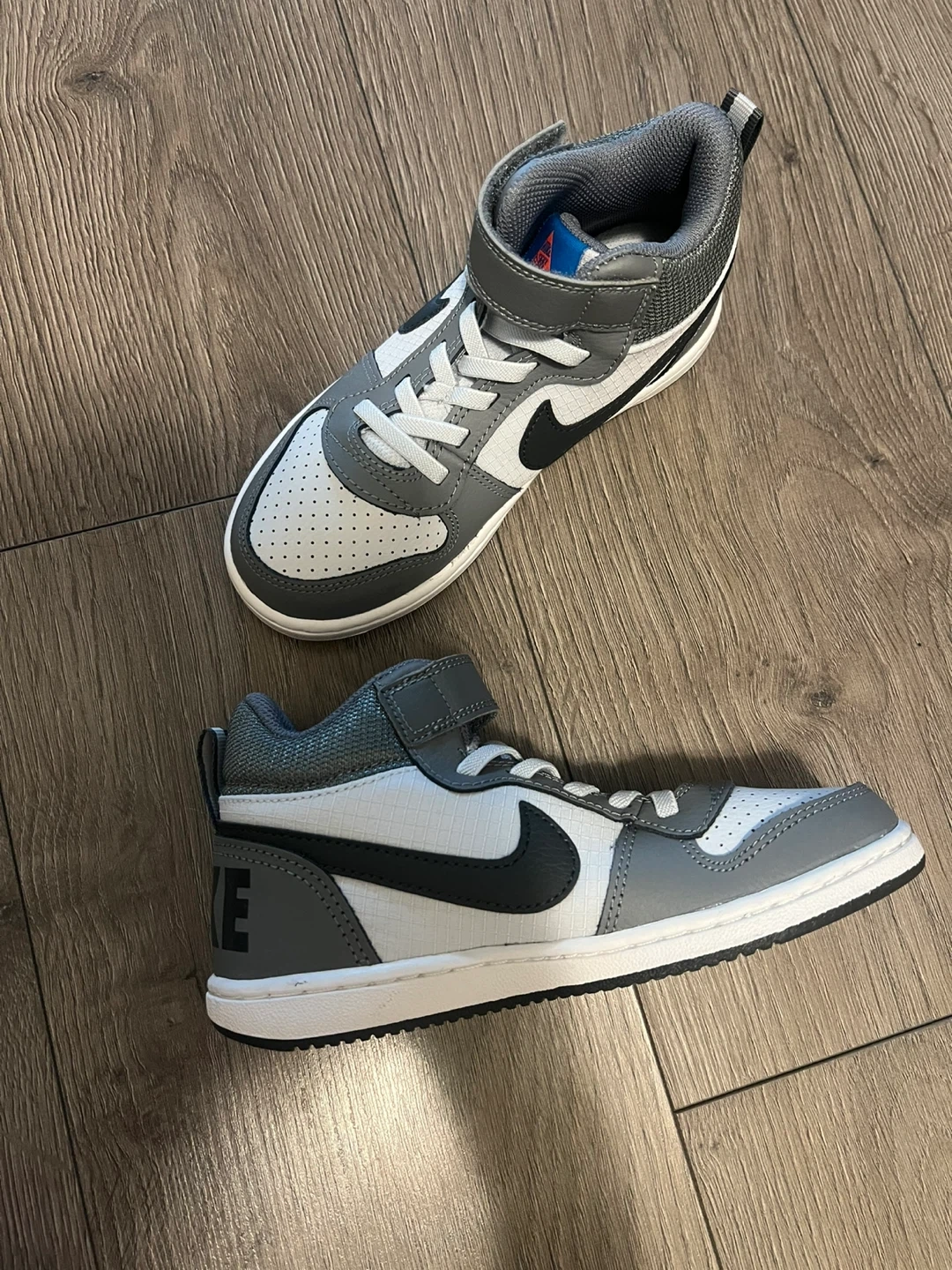 60These are a pair of Nike Court Borough Mid 2 toddler sneakers. They feature a grey and white colour scheme with the iconic Nike swoosh. Perfect for your little one! Size 13.5 or 31.5 Age 6-8