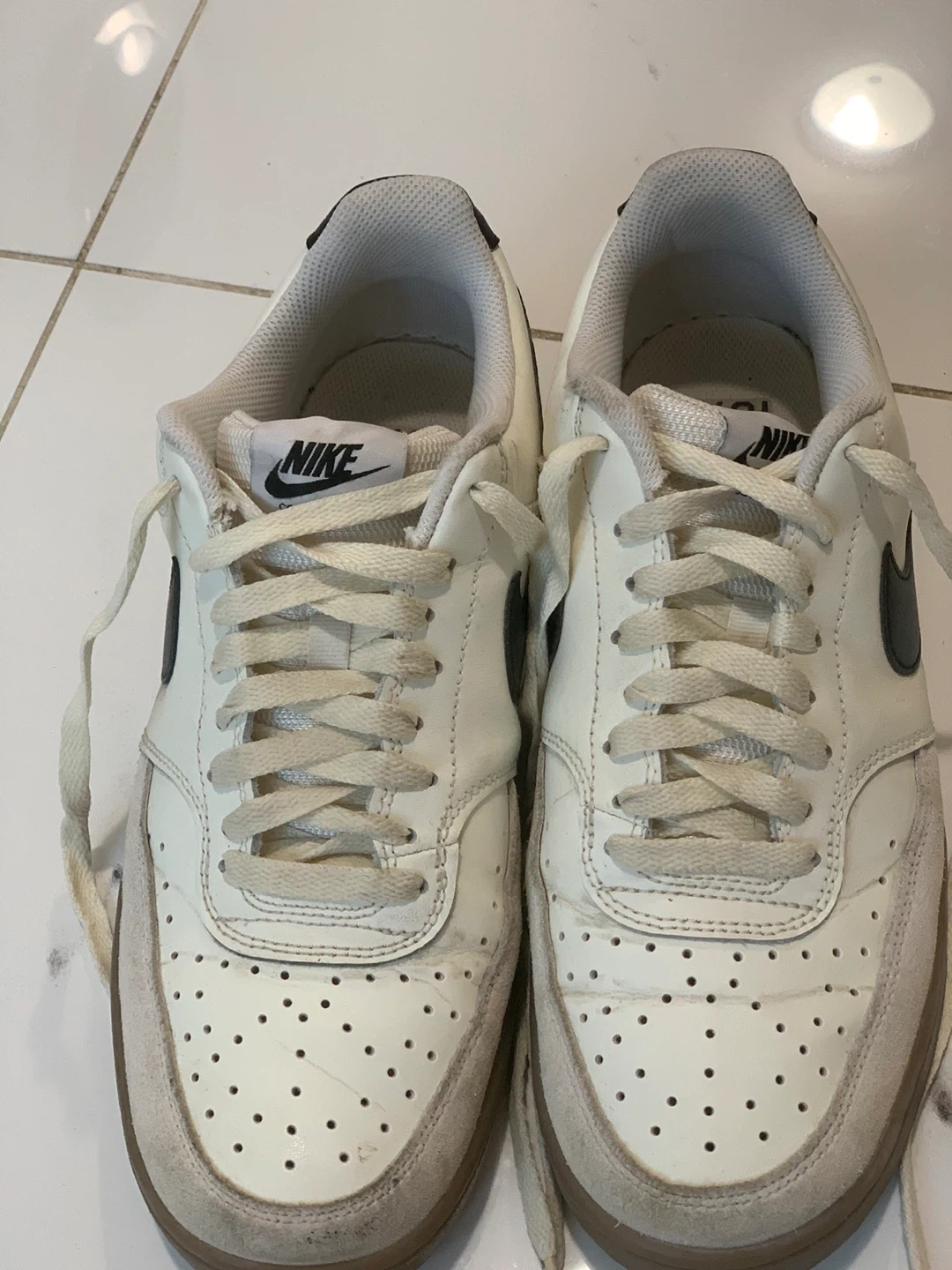 18Selling a pair of Nike Court Vision Lo sneakers in size 9. These sneakers feature a sail/black/lt orewood brn colourway. They're in used condition, but still have lots of life left! Comes with the original box