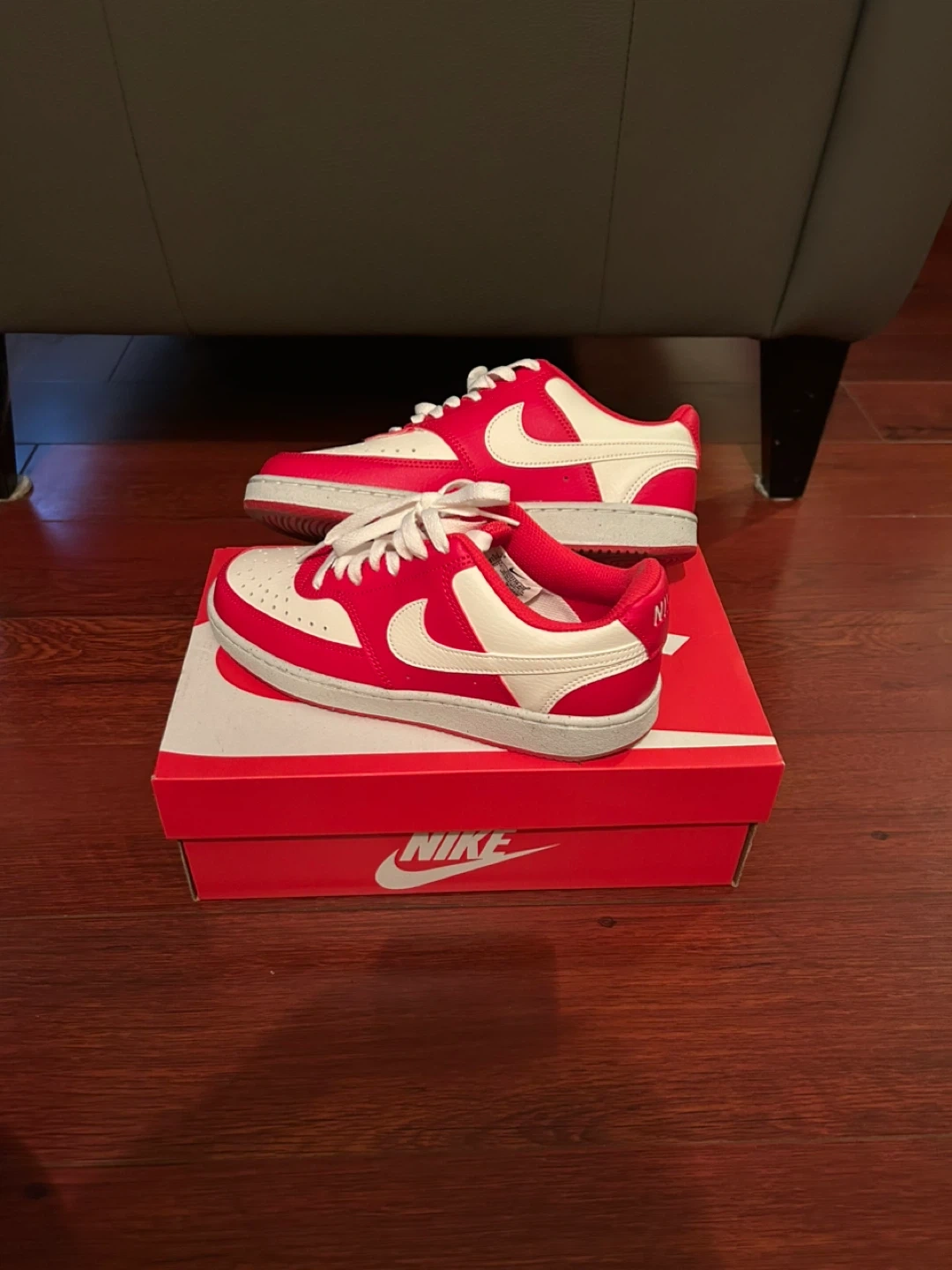74Selling a pair of Nike Court Vision Low shoes in red and white. They're practically new worn only once. Not a single scratch or dirt this is a very good deal. The size is 6 or 230mm. It is sized in womens.