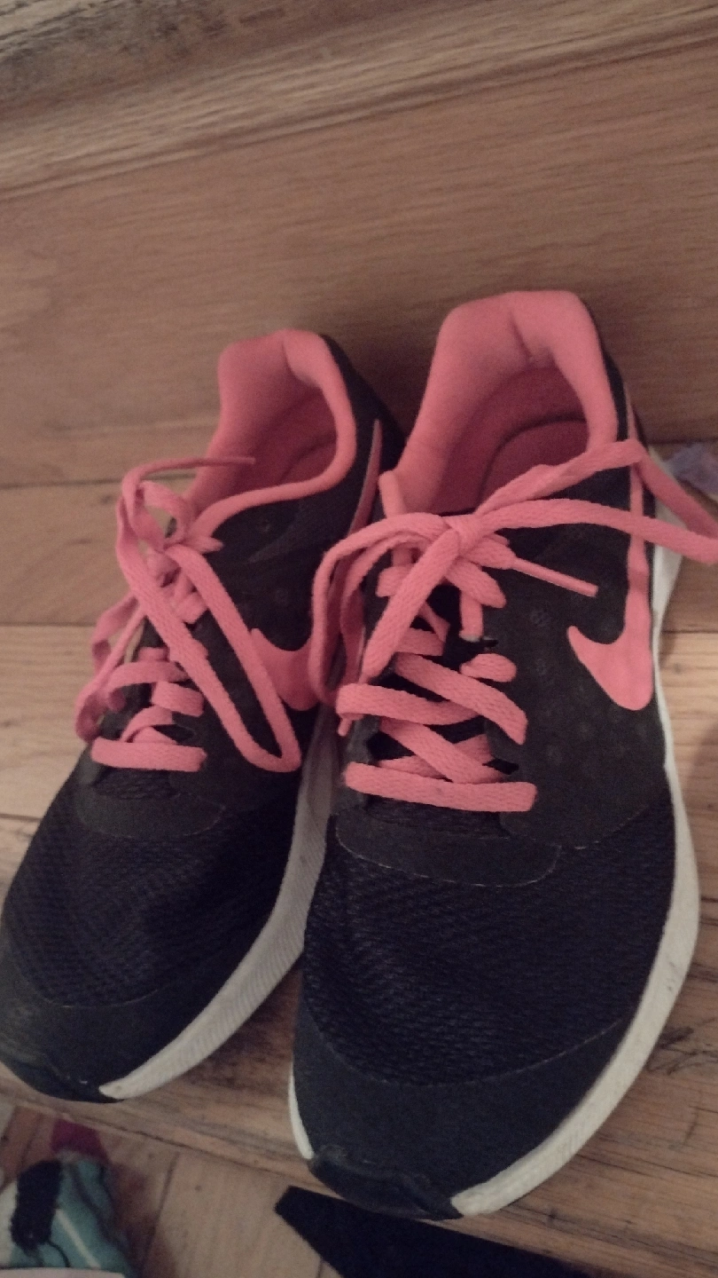 Selling a pair of Nike Downshifter 7 running shoes for youth in size 3.5Y. They are black with pink accents. Great for running or everyday wear!
