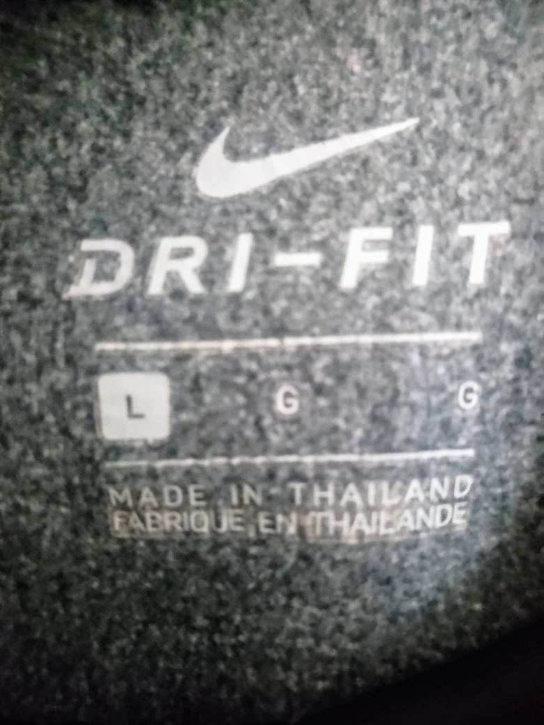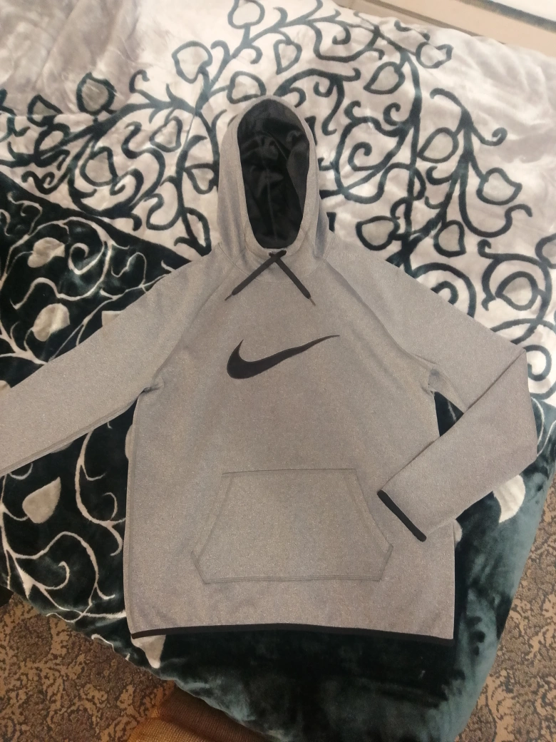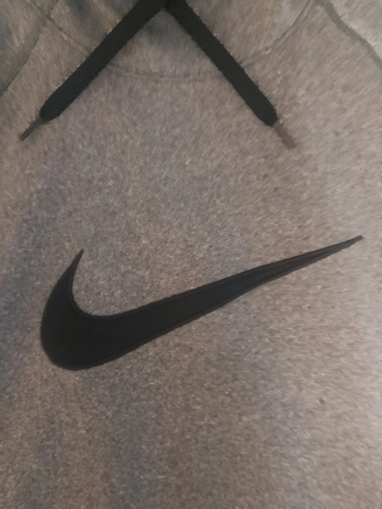 15Men's Nike Dri-FIT hoodie. Grey colour, large size. Features a large Nike swoosh logo and drawstring hood. Pocket included.
