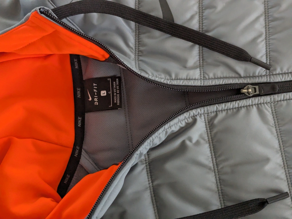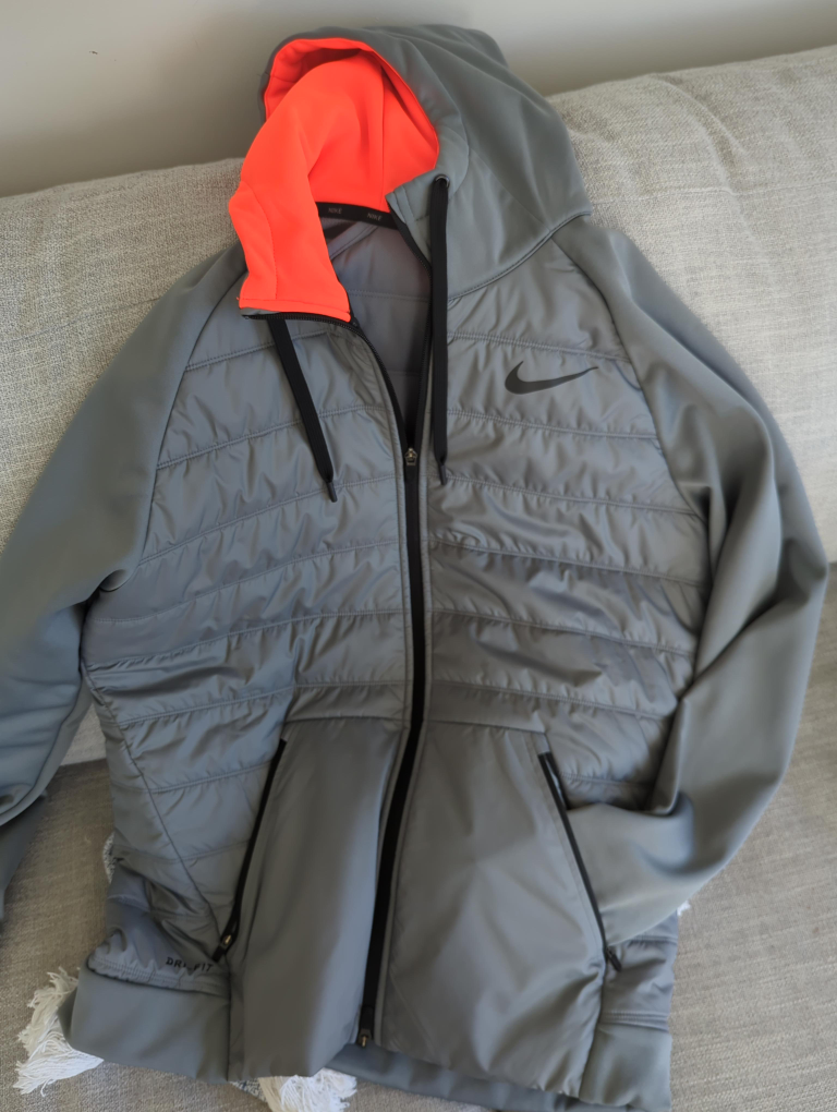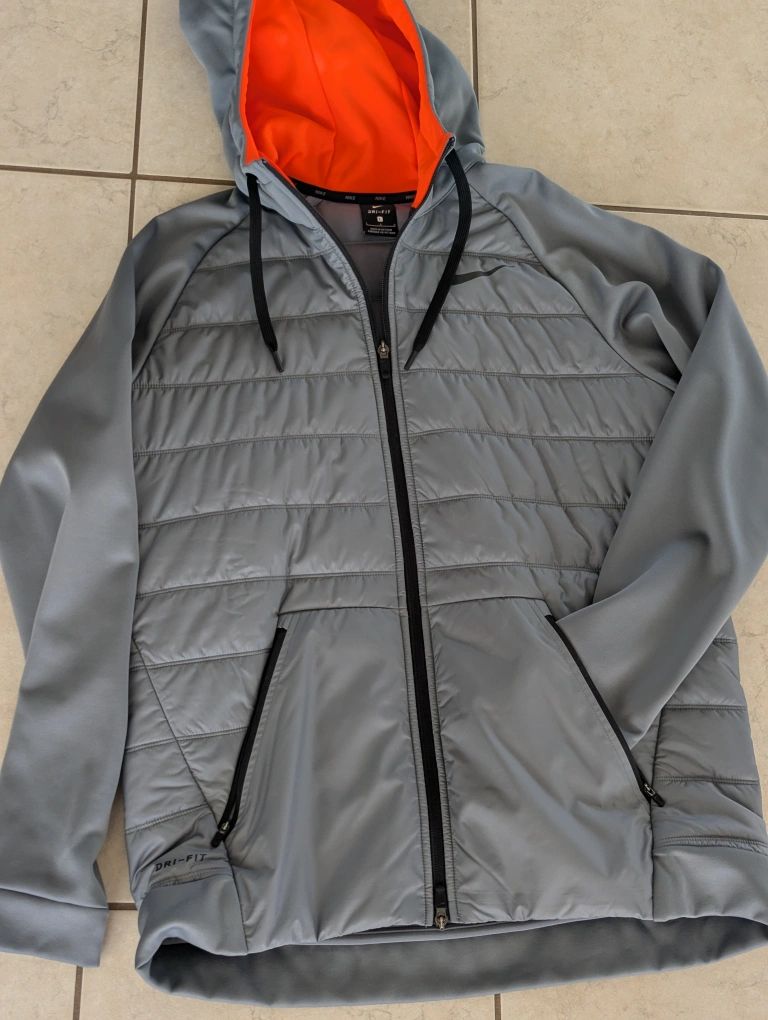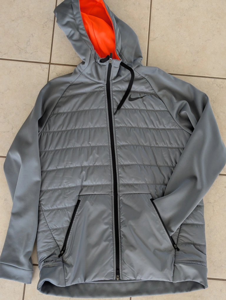 Selling a Nike Dri-FIT padded jacket in size large. It's grey with an orange lining in the hood. Great for staying warm and dry during workouts or everyday wear!