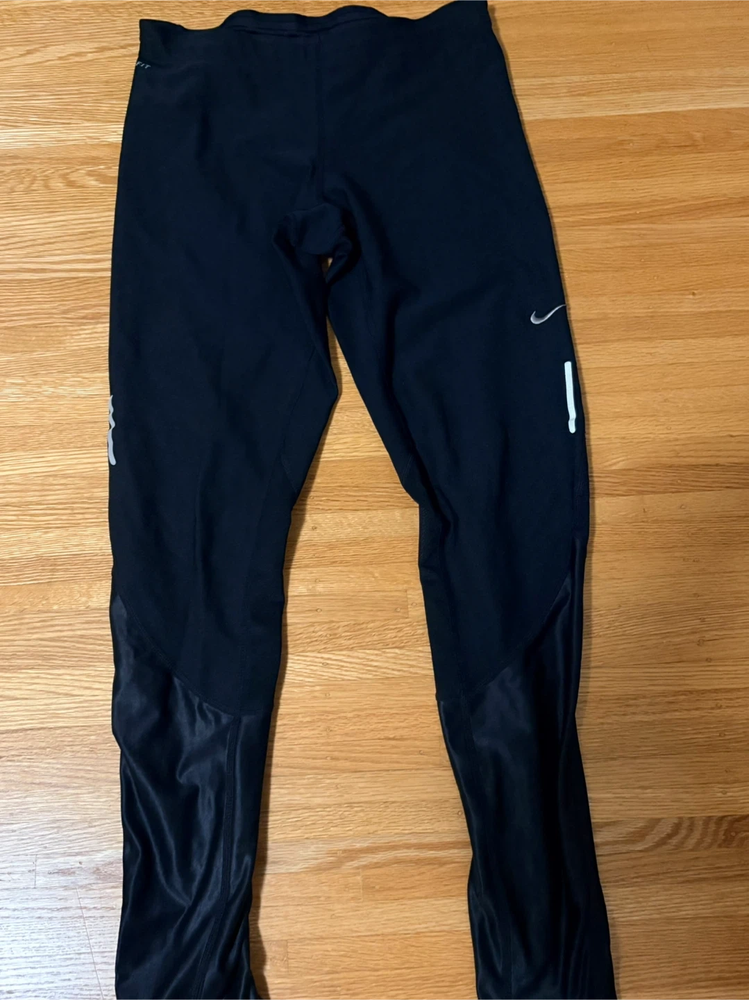 Selling a pair of Nike Dri-Fit running tights in a size small. These are perfect for running or any other workout. They are made with a blend of polyester and elastane for a comfortable and flexible fit. The tights feature reflective details for increased visibility in low-light conditions. They have a zip from the ankle. Includes a pocket at the back. Worn 3-4 times, so they’re like brand new.