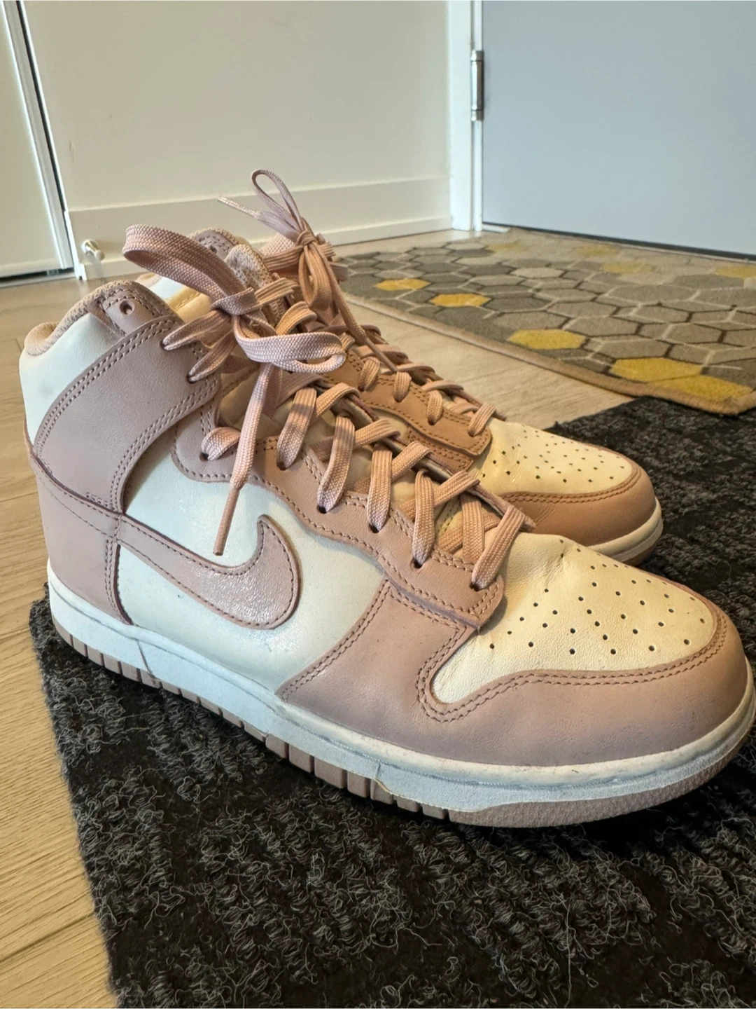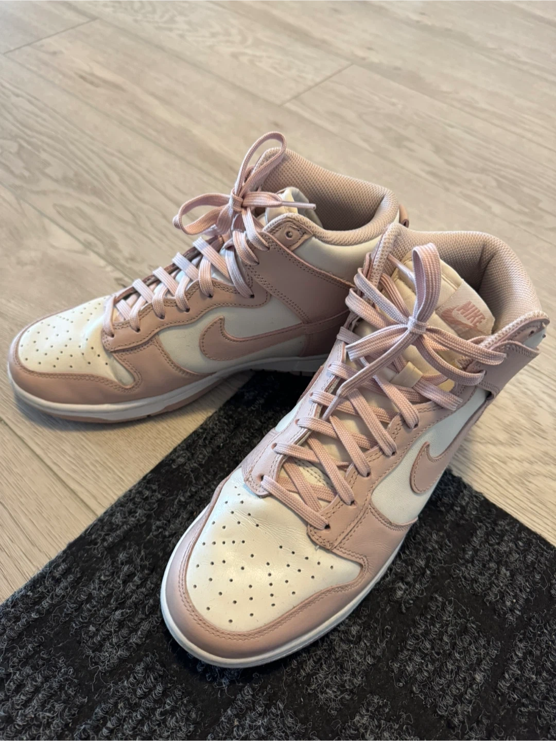 60Nike Dunk High – Pink/Beige | EUR 40 (Women’s 9) Lightly used Nike Dunk High sneakers featuring a soft pink and beige leather upper. Clean and well-maintained, with only minor signs of wear. A comfortable and stylish pair perfect for everyday wear. Condition: Gently used Size: EUR 40 / Women’s 9 Price: $50 Includes: Shoes only (no box)