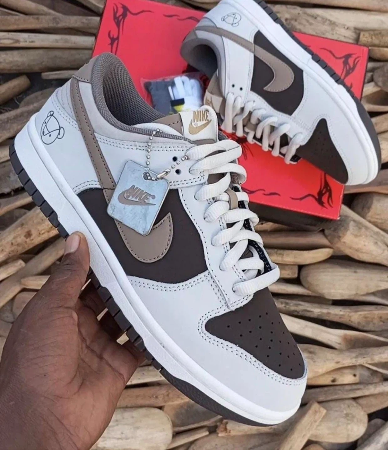 0Selling a pair of Nike Dunk Low sneakers in a stylish brown and white colourway. These shoes are in great condition and come with the original box. Perfect for adding a touch of style to your everyday look!