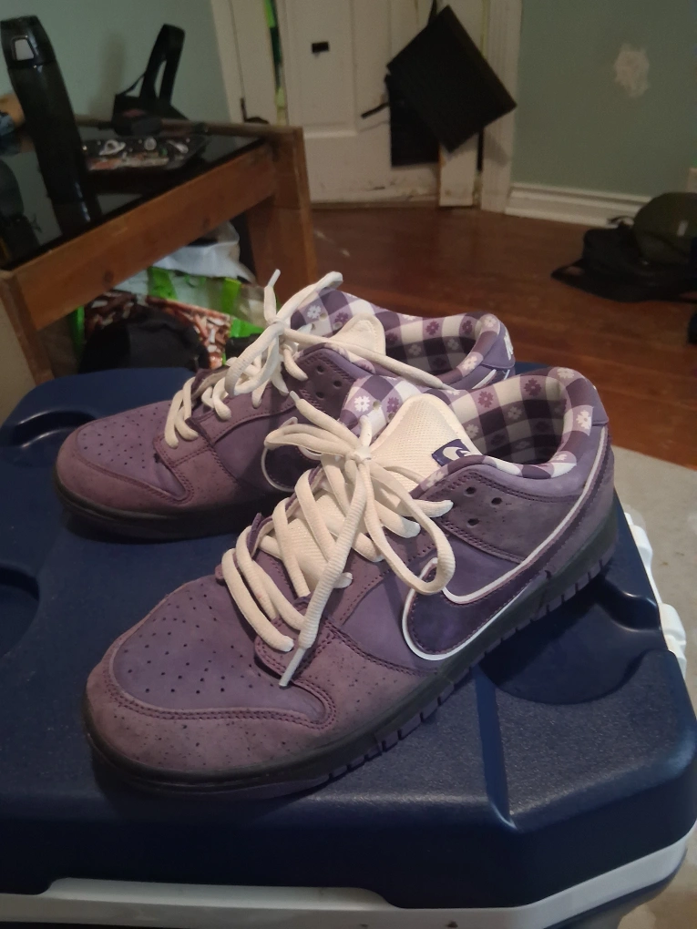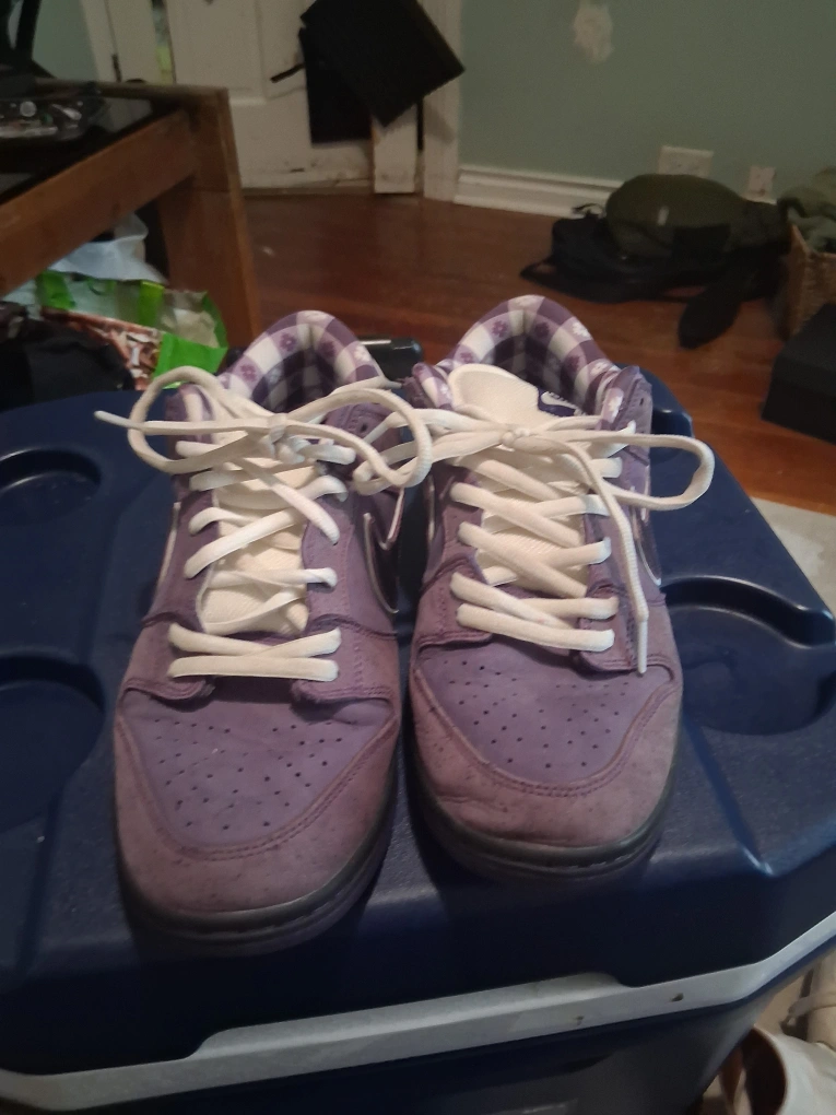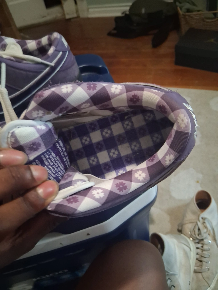 79Selling a pair of Nike Dunk Low sneakers in a lovely purple gingham pattern. They have white laces and the classic Nike swoosh on the side. These are a stylish and comfortable pair of shoes, perfect for adding a pop of colour to your outfit!