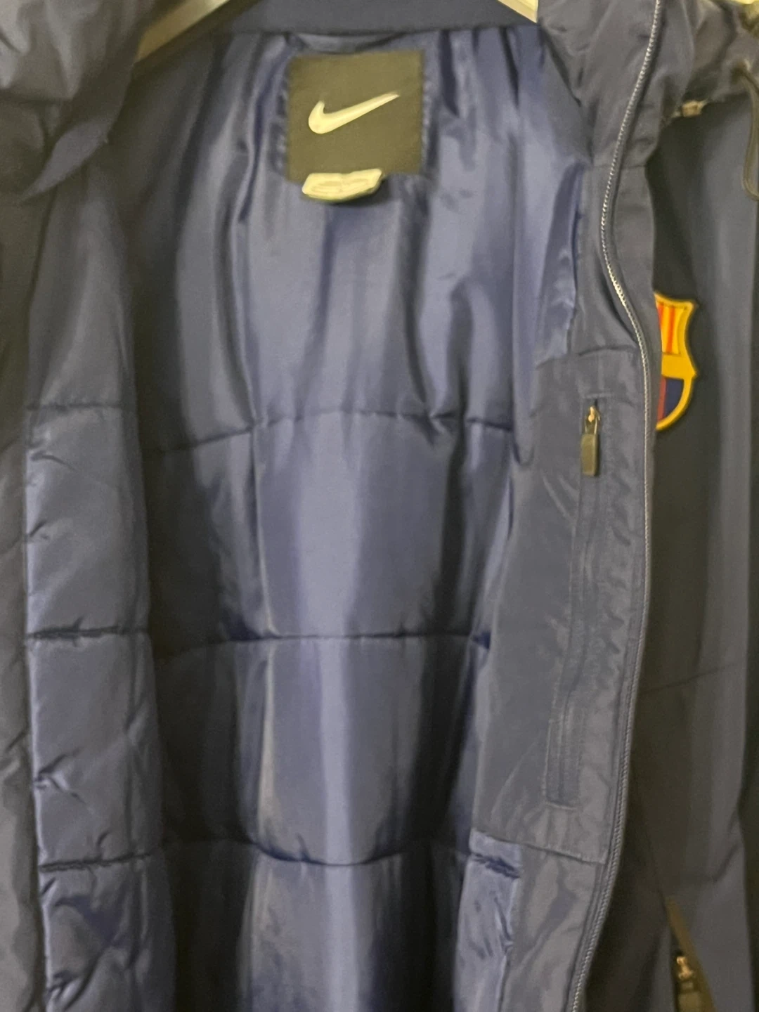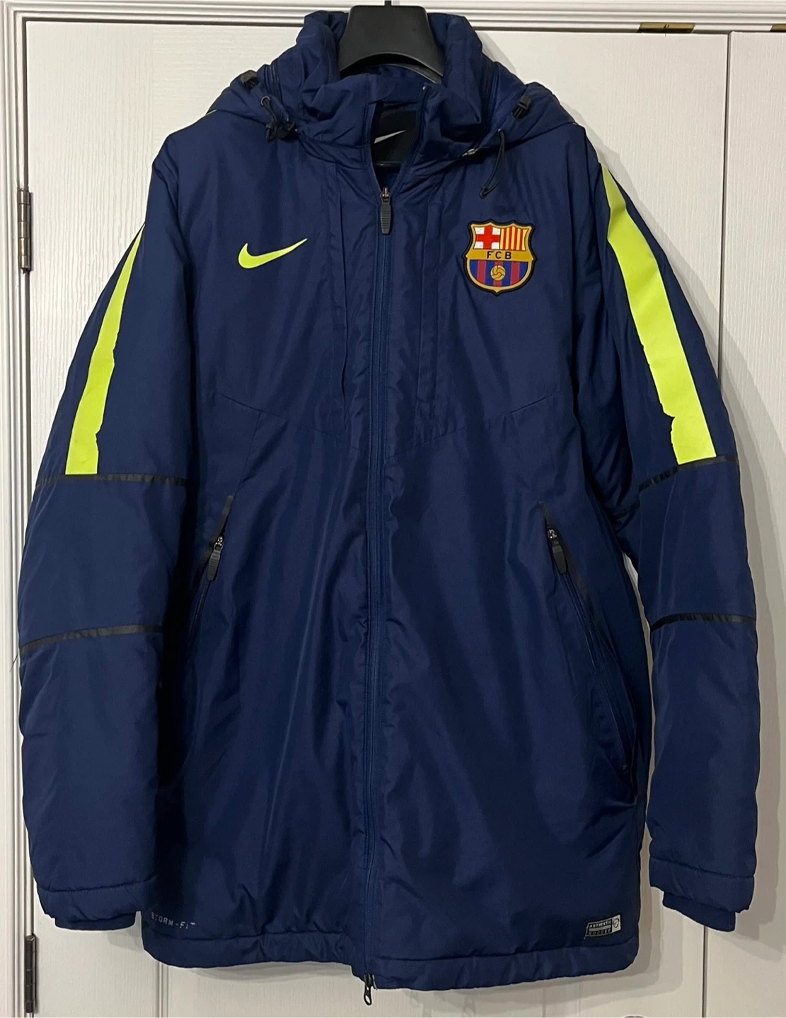 Nike FC Barcelona Storm-FIT jacket in great condition in a Men’s size Large. It's a navy blue colour with yellow accents and the FC Barcelona logo. Perfect for staying warm and dry during those chilly days!