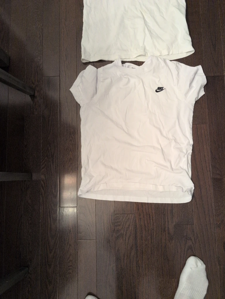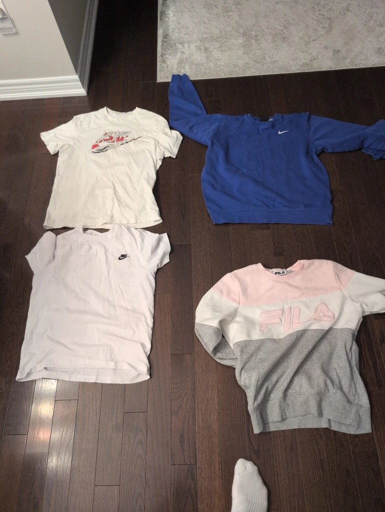 29Selling a bundle of shirts and a sweatshirt! Includes: - Two white Nike t-shirts - One blue Nike sweatshirt - One Fila sweatshirt (pink, white, and grey)