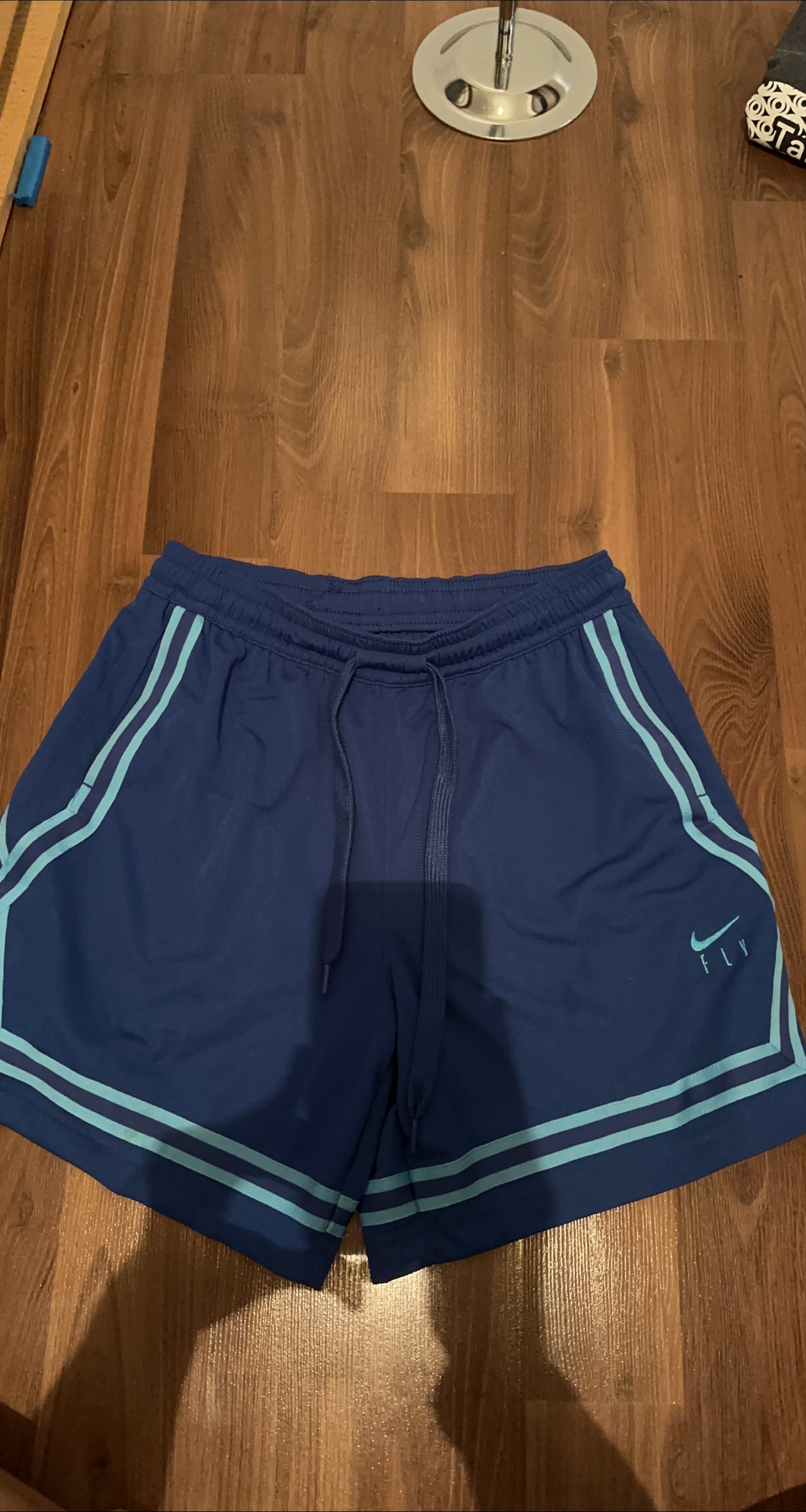 21Selling a pair of Nike Fly shorts in navy blue! These shorts feature a comfortable elastic waistband with a drawstring. The design includes light blue stripes down the sides and a subtle Nike logo with 'FLY' on the front. Perfect for sports or casual wear!