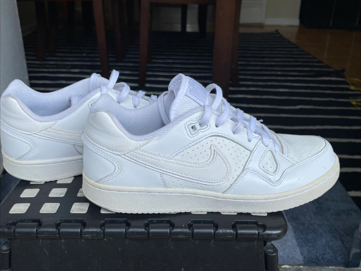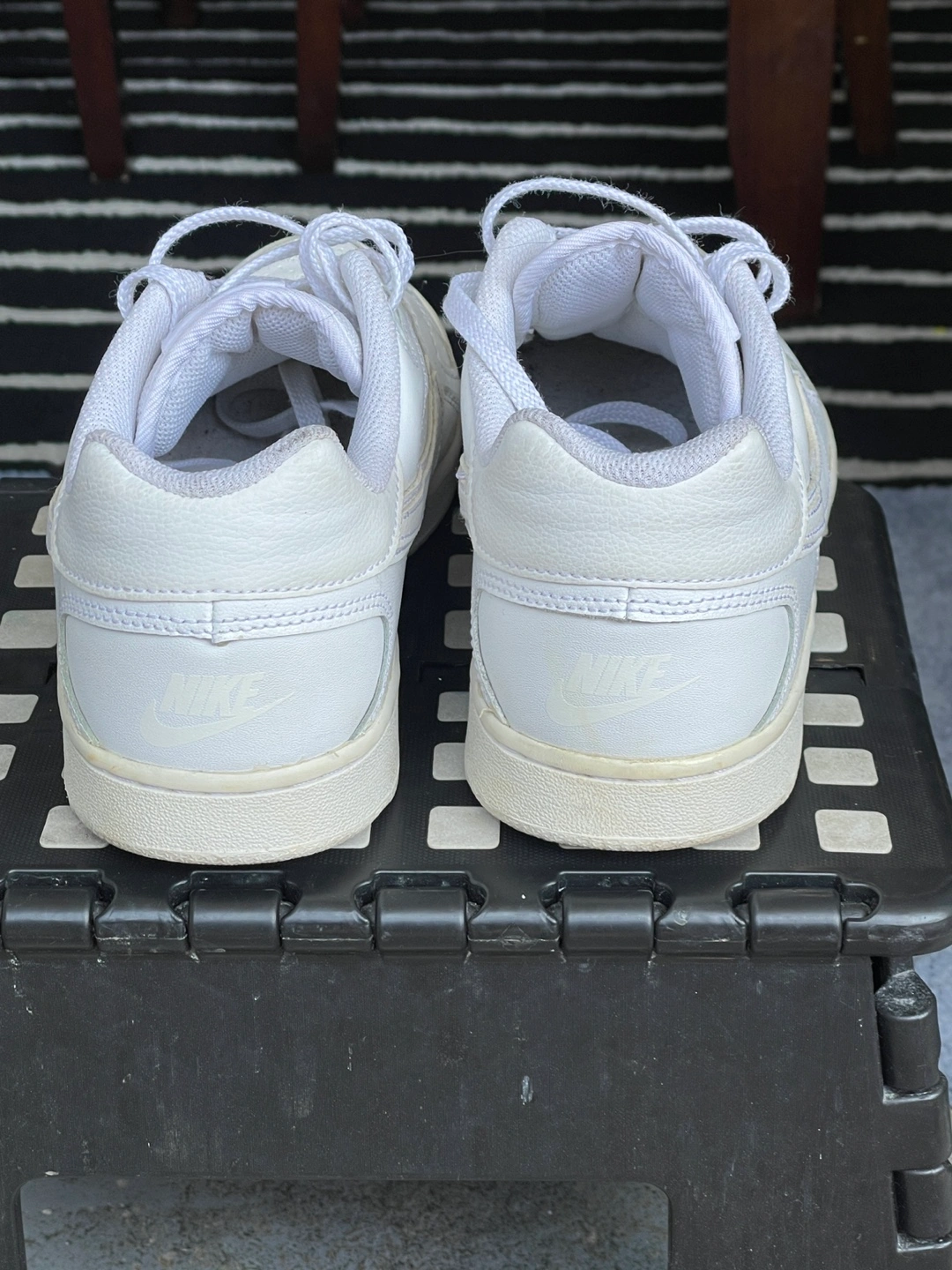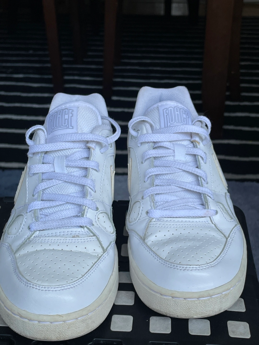 175Pair of white leather Nike Force 1 low-top sneakers. Classic design, lace-up closure. Good for casual wear.