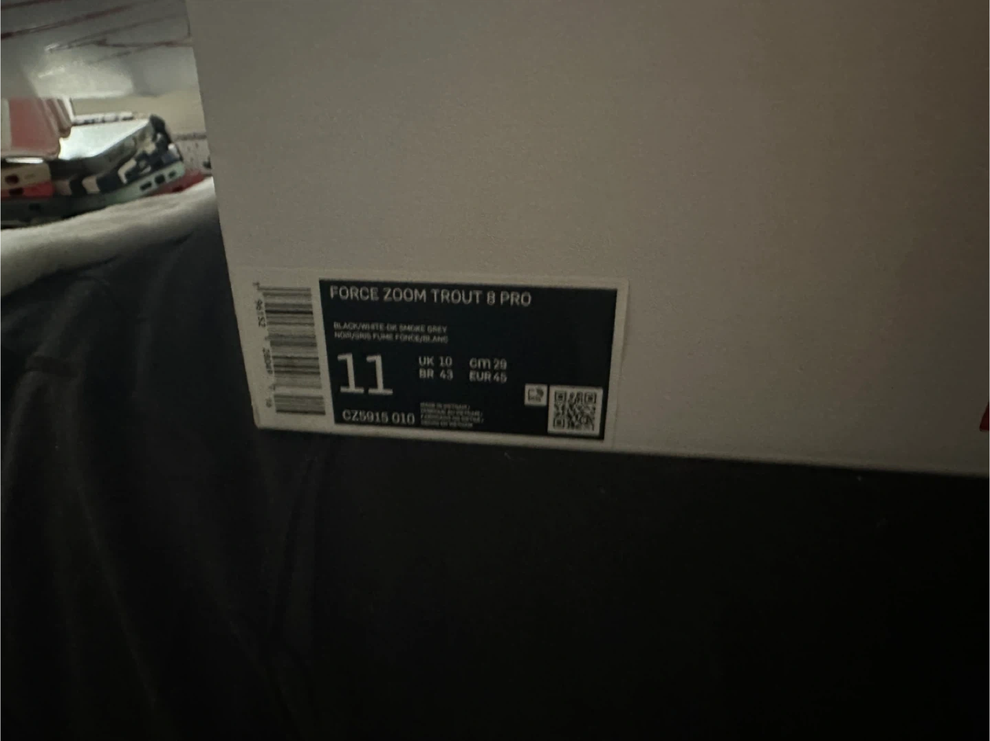 Selling a pair of Nike Force Zoom Trout 8 Pro baseball cleats in size 11. They are black, white, and dark grey. The box is included!