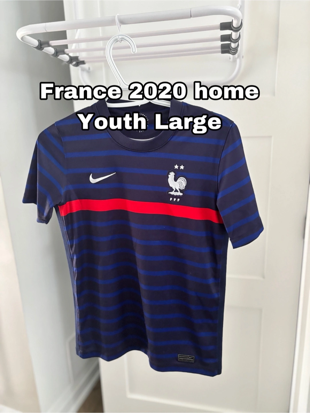 Selling a Nike France 2020 home jersey in youth large size. The jersey features the iconic blue and red striped design with the French national team crest and Nike logo. Perfect for young fans!