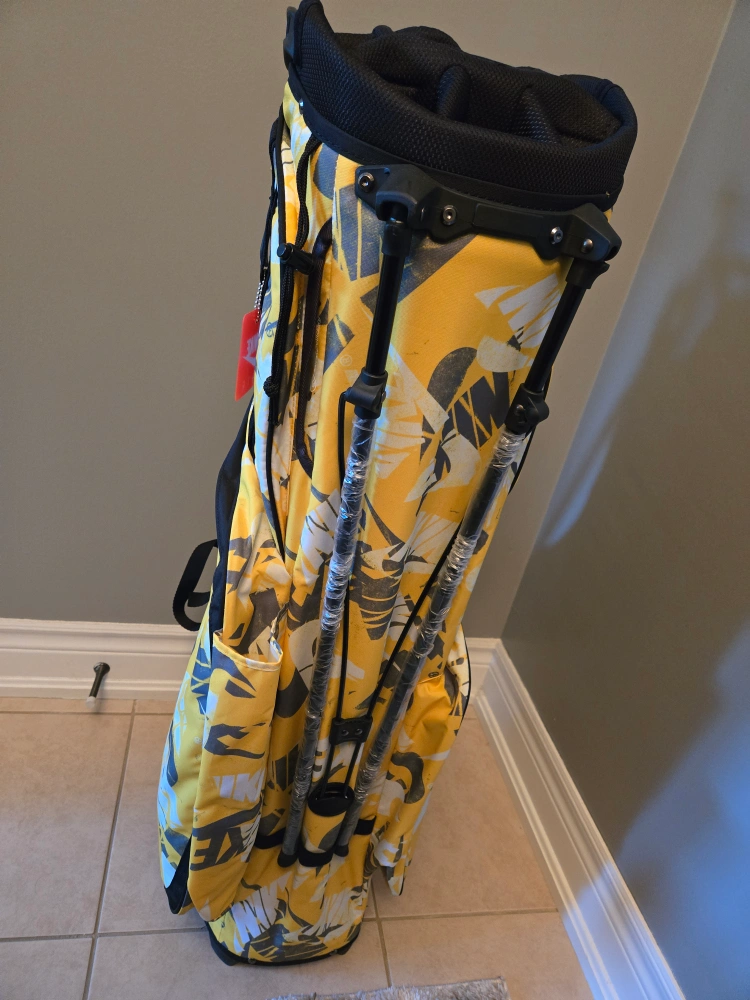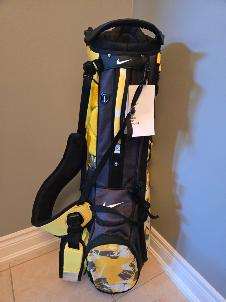 Nike Golf Hybrid stand bag in a stylish yellow and grey colour scheme. It's lightweight and has a stand for convenient placement. Pick up weston road and rutherford road. Cash only