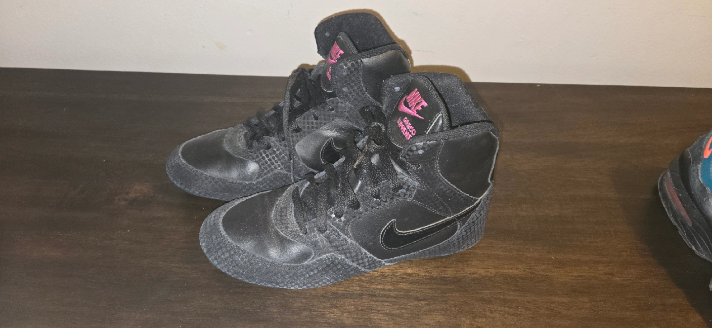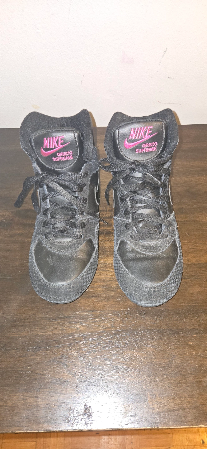 Selling a pair of Nike Greco Supreme wrestling shoes. They are black with pink Nike logos. Great for wrestling or training!