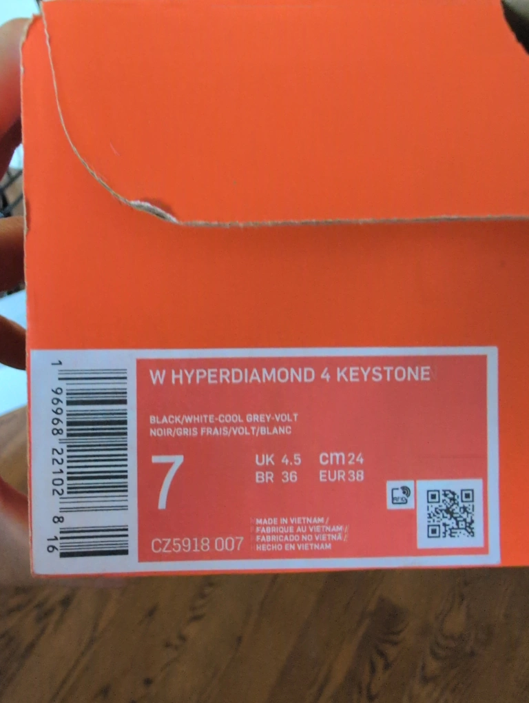 Selling a pair of women's Nike Hyperdiamond 4 Keystone baseball cleats in size 7. They are black/white-cool grey-volt. Comes with the original box