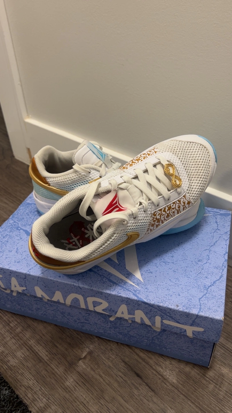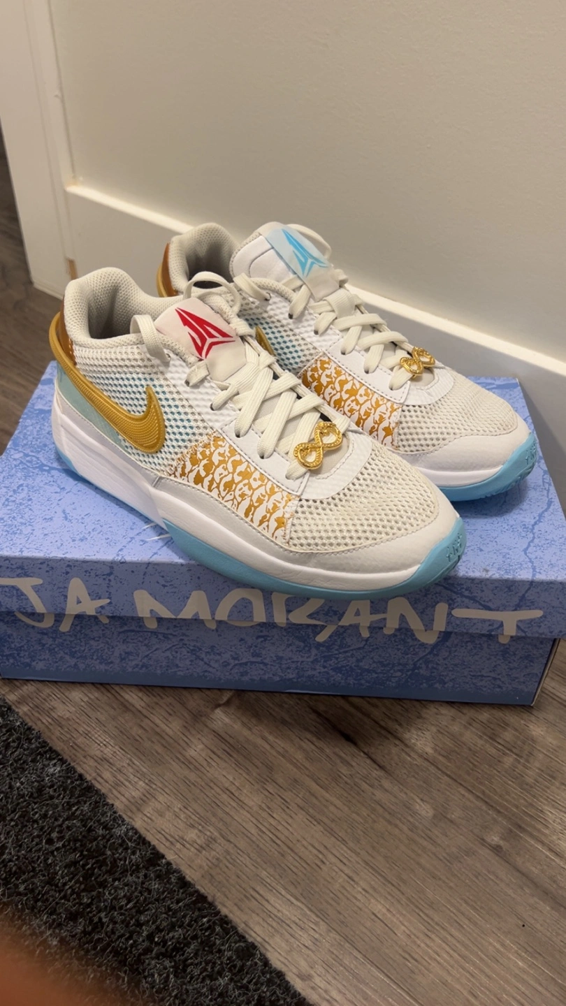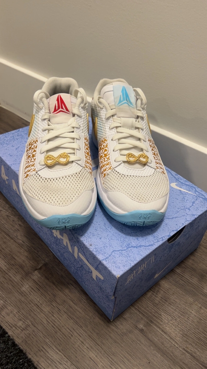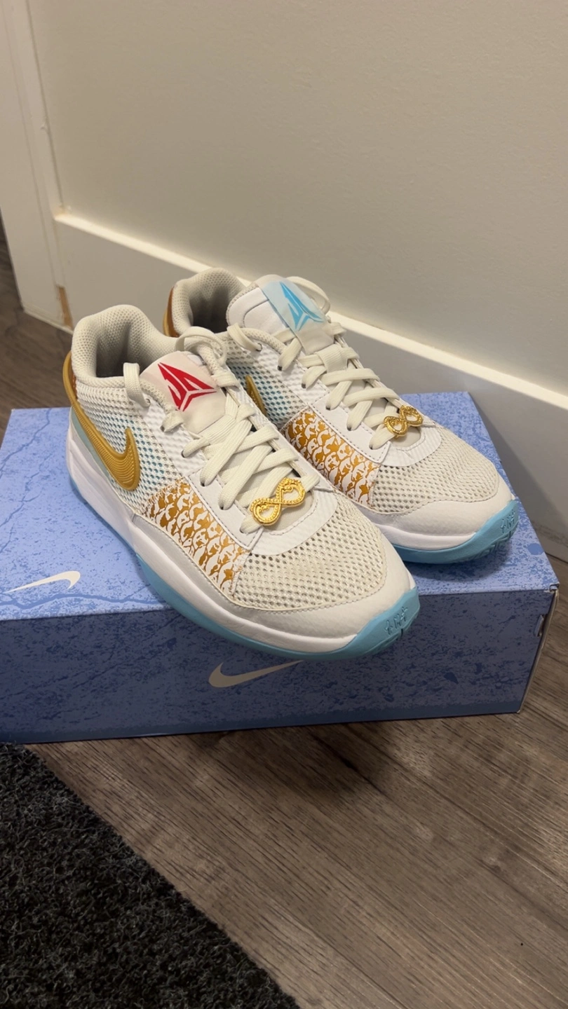10Ja 1 basketball shoes in white and gold. Shoes come with white laces. A gold infinity charm on the laces. They're great to wear while playing sports, or just for everyday wear. Text for more info.They come with the box.