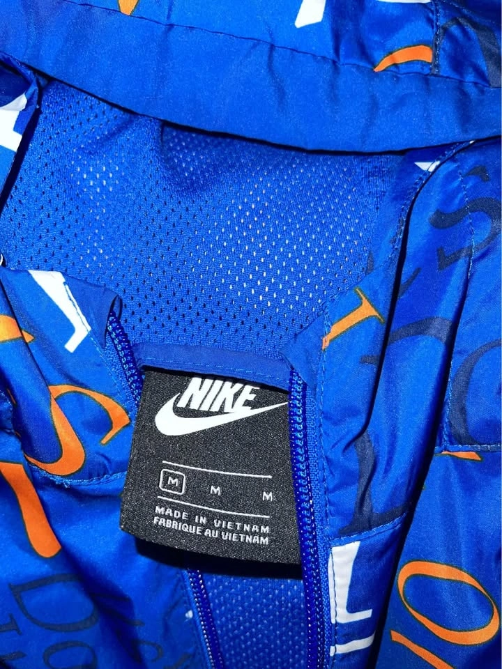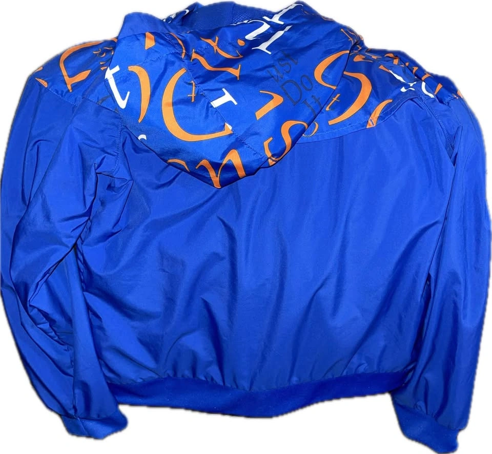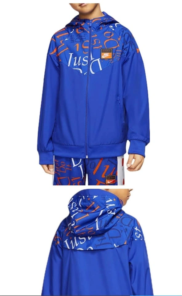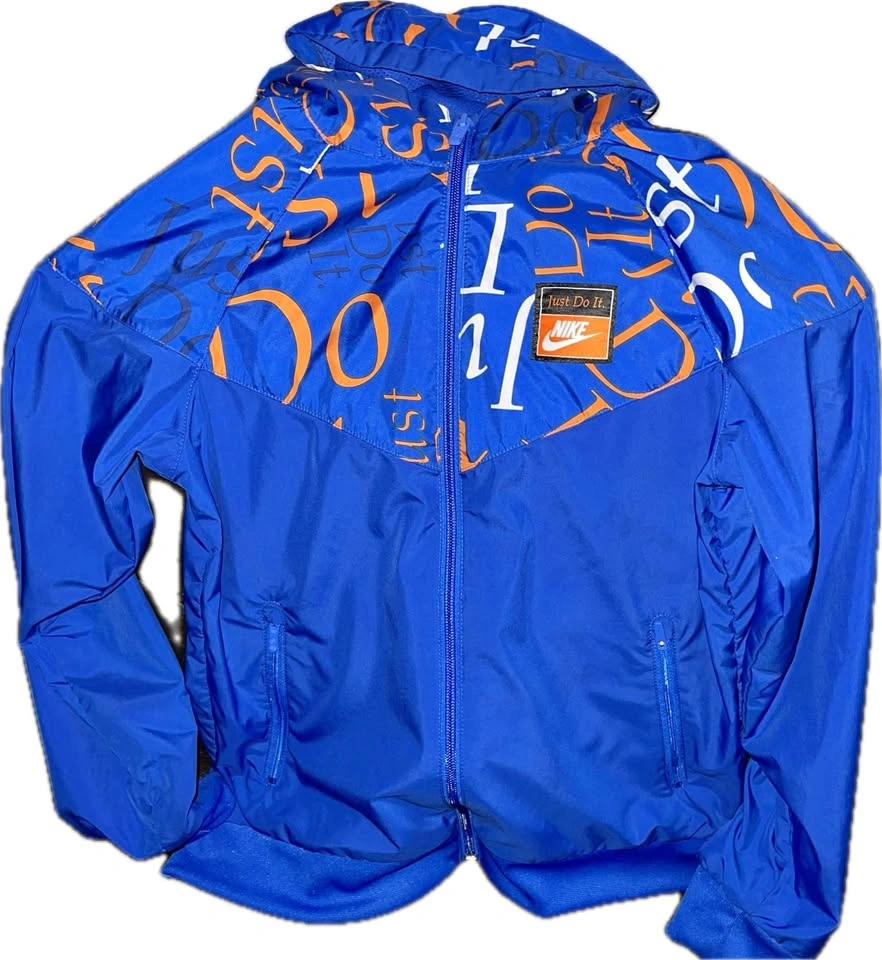 15Medium Nike windbreaker jacket. Light polyester fabric with breathable mesh lining. Hoodie neck and cutted long sleeves. Zip-up front closure and dual side pockets.