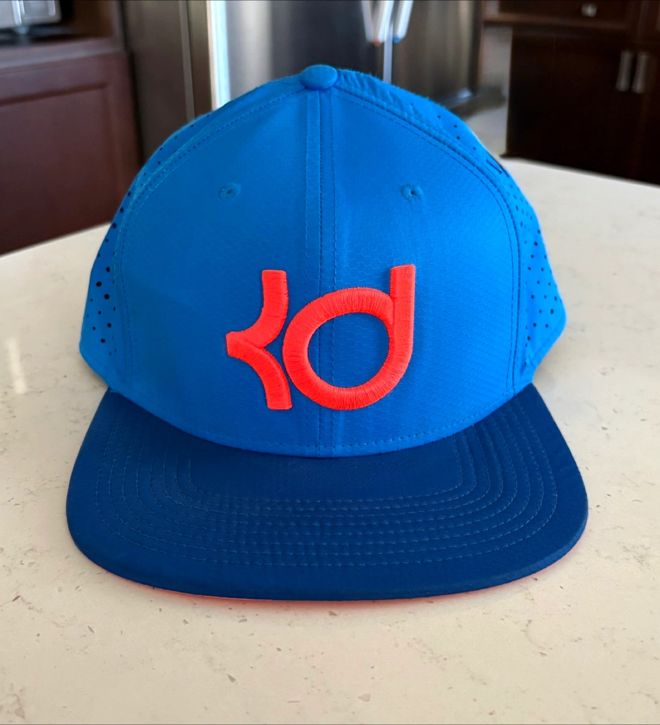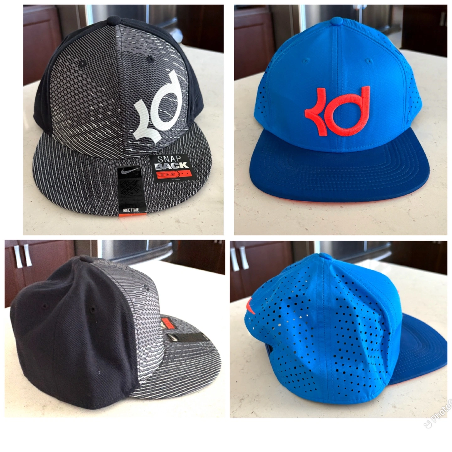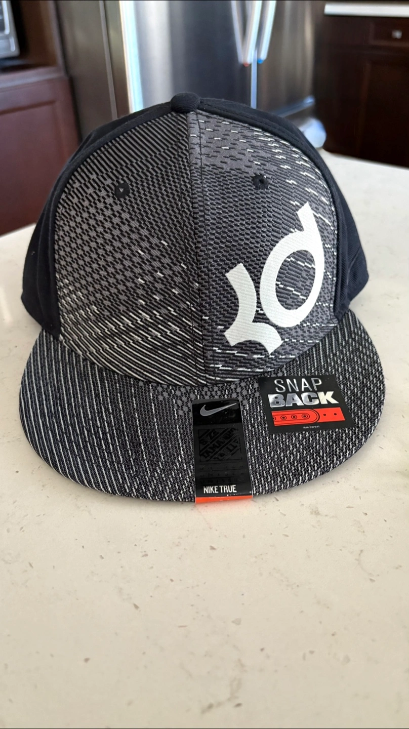 Two Nike KD snapback hats for sale! One is black and grey with a white KD logo, and the other is blue with an orange KD logo. Both are brand new with tag . It's brand new and features a classic snapback closure for an adjustable fit. The bright brim adds a nice pop of colour! $18 each each each