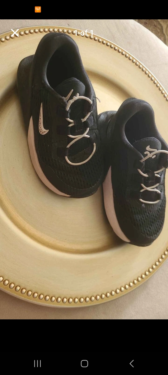 20Here are a pair of Nike running shoes for kids. They're black with white laces and the Nike swoosh logo on the side. Perfect for your little one's active adventures!