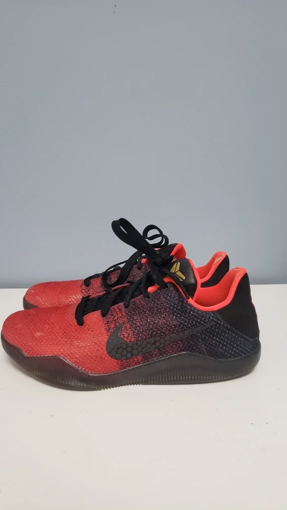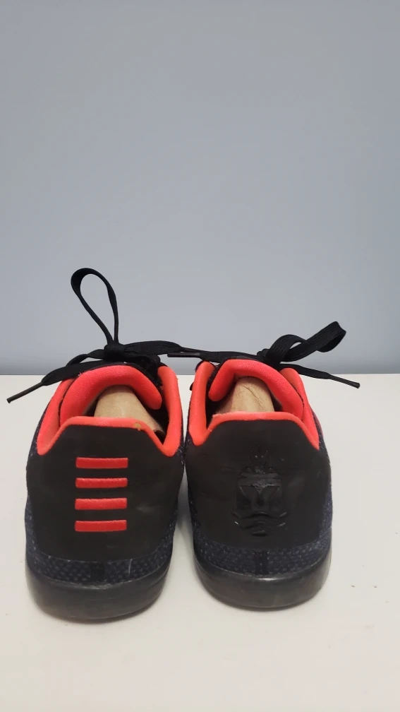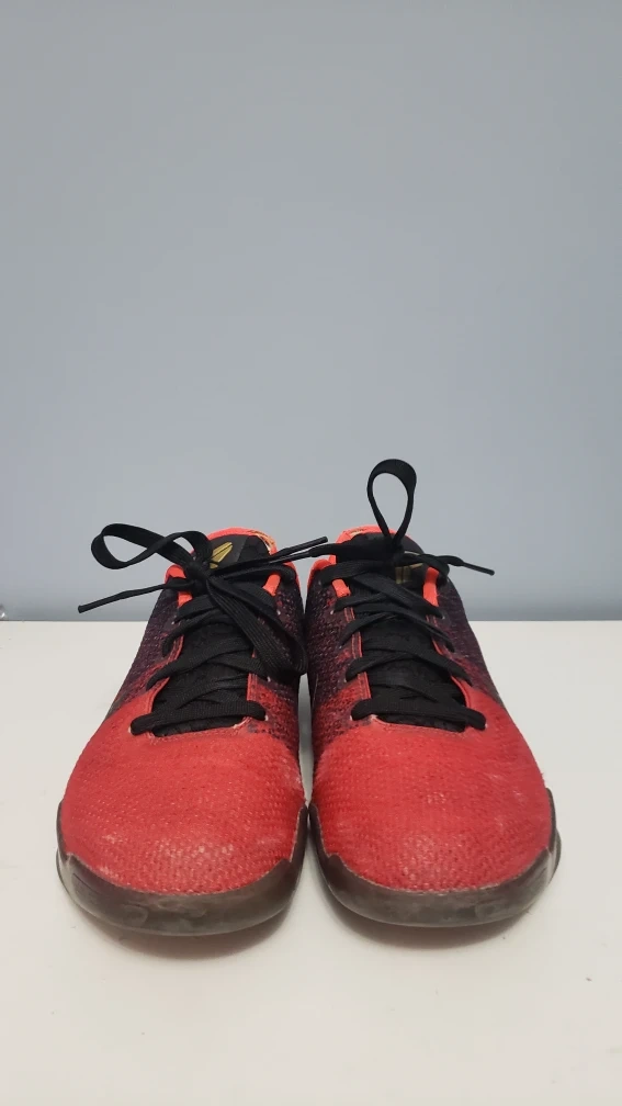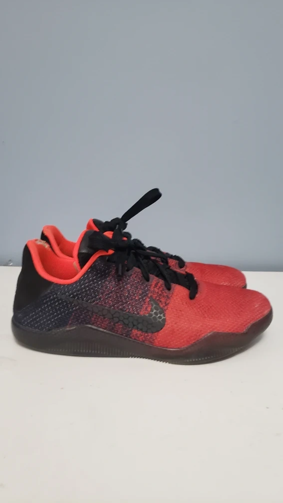 19Red and black Kobe A.D. basketball shoes. Knit upper. Low-top design. Lace-up closure. Good for the court.