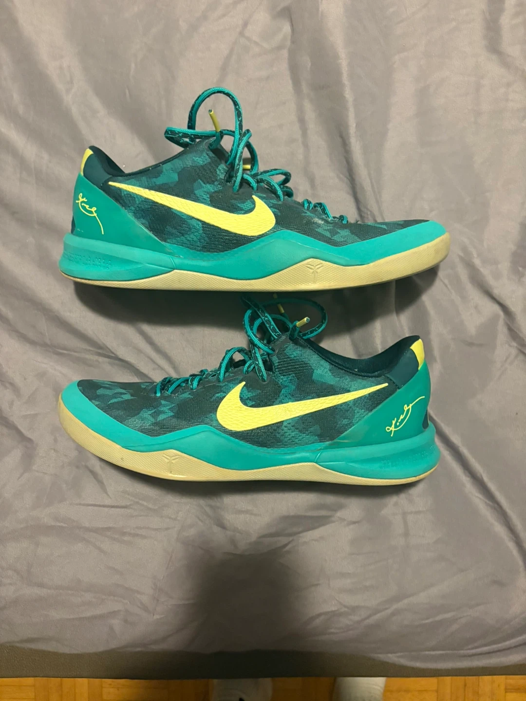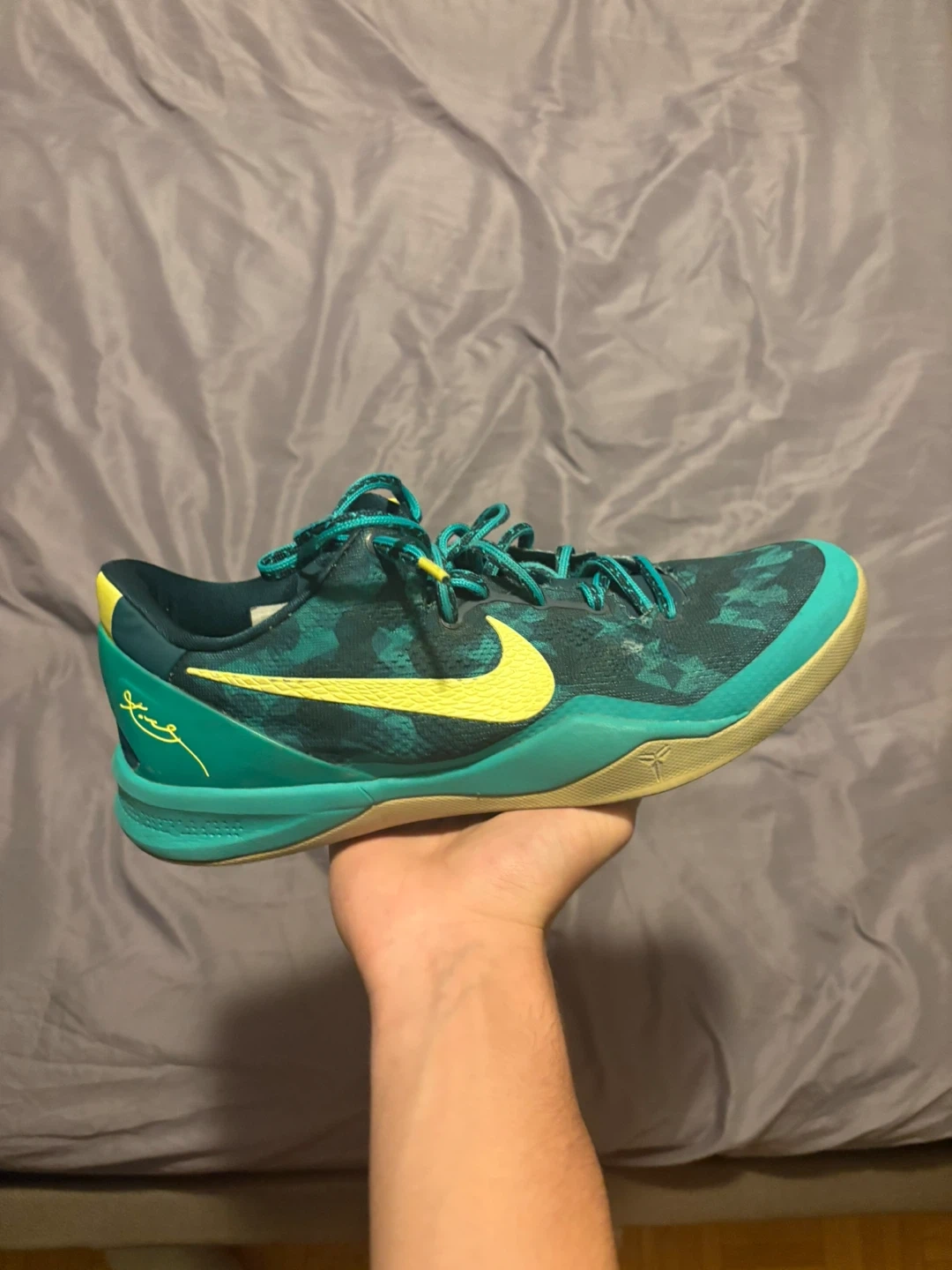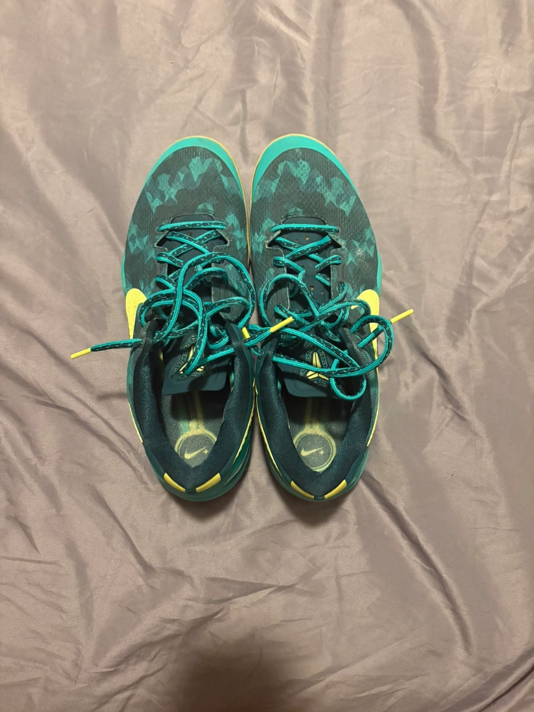 Selling a pair of Nike Kobe M8 basketball shoes in a teal and yellow colourway. They are in good condition with some signs of wear. Perfect for playing ball or just for casual wear and willing to trade