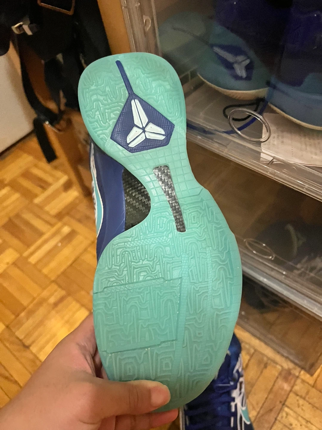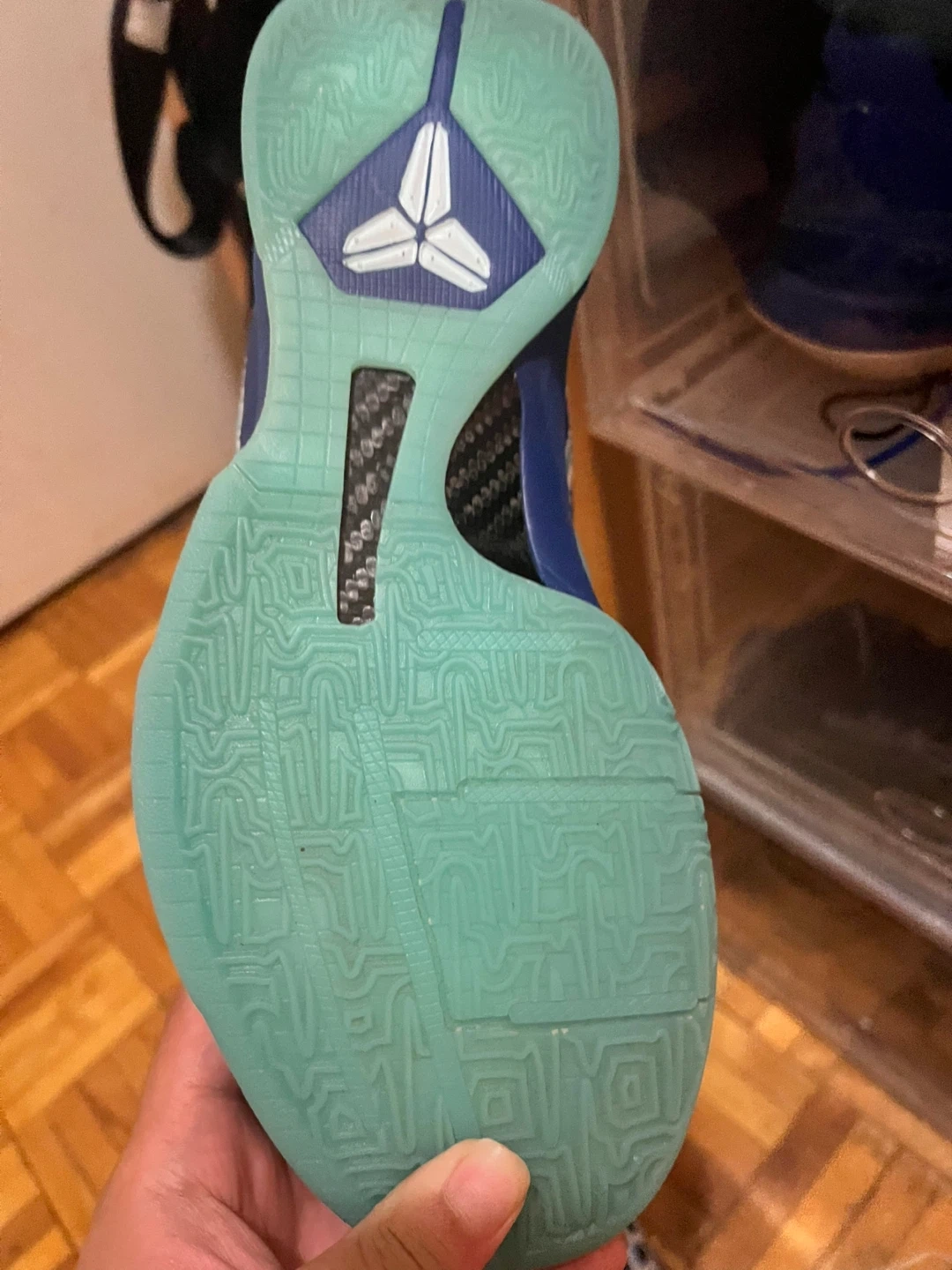Selling a pair of Nike Kobe V Protro sneakers in Deep Royal Blue. They are a size 9.5 . The shoes have a unique design with skeleton foot graphics. The soles are a light teal colour.