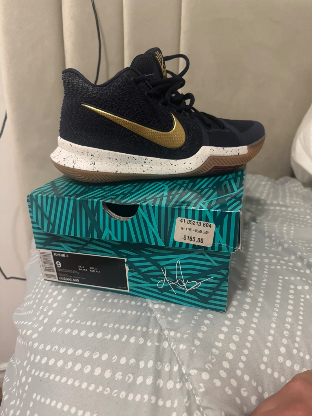 10Selling a pair of Nike Kyrie 3 basketball shoes in size 9. They feature a sleek black design with gold accents. The original box is included