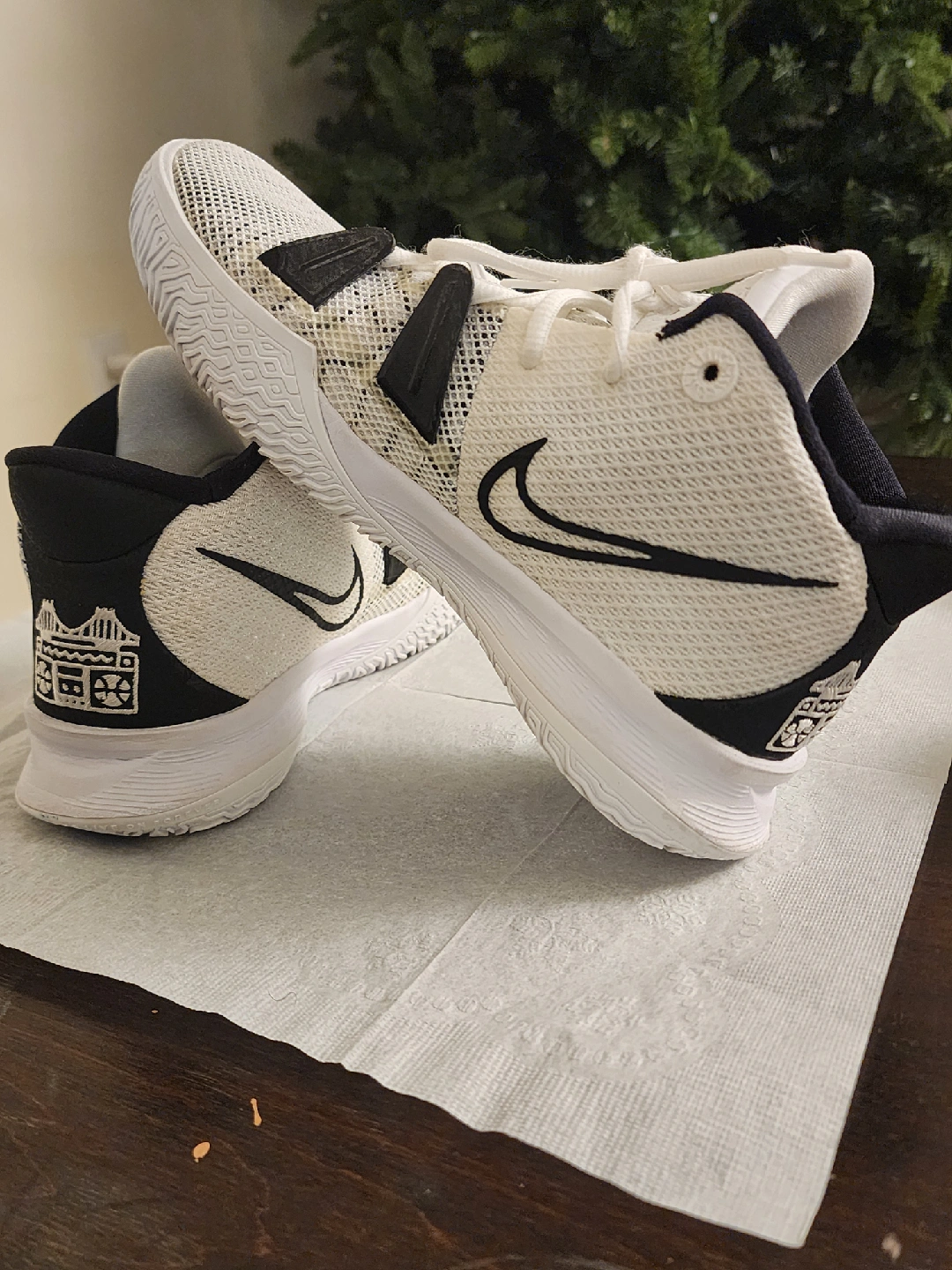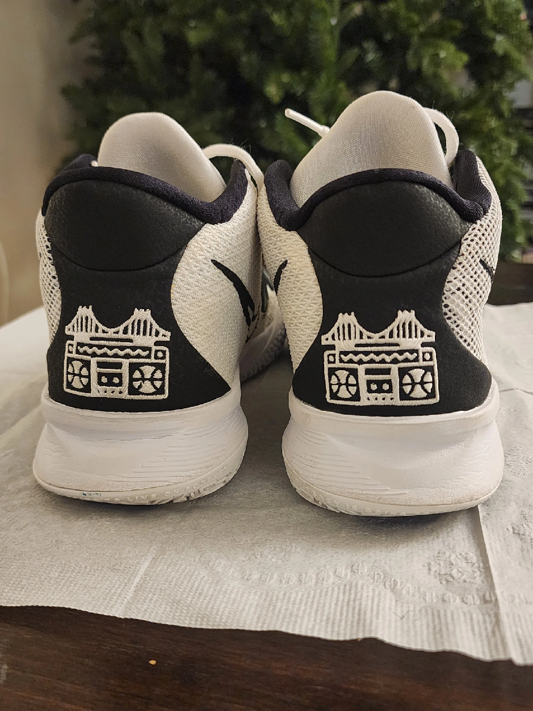 These are gently used pair of Nike Kyrie Flytrap 6 basketball shoes. They are in great condition. They feature a white and black colour scheme with the Nike swoosh on the side. The heel has a unique design. Great for playing ball or just casual wear!