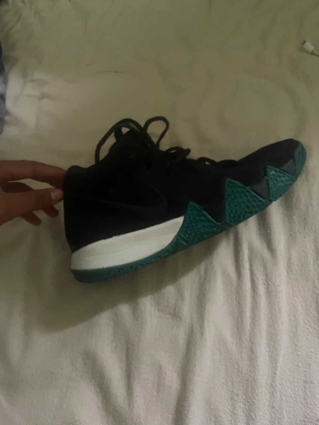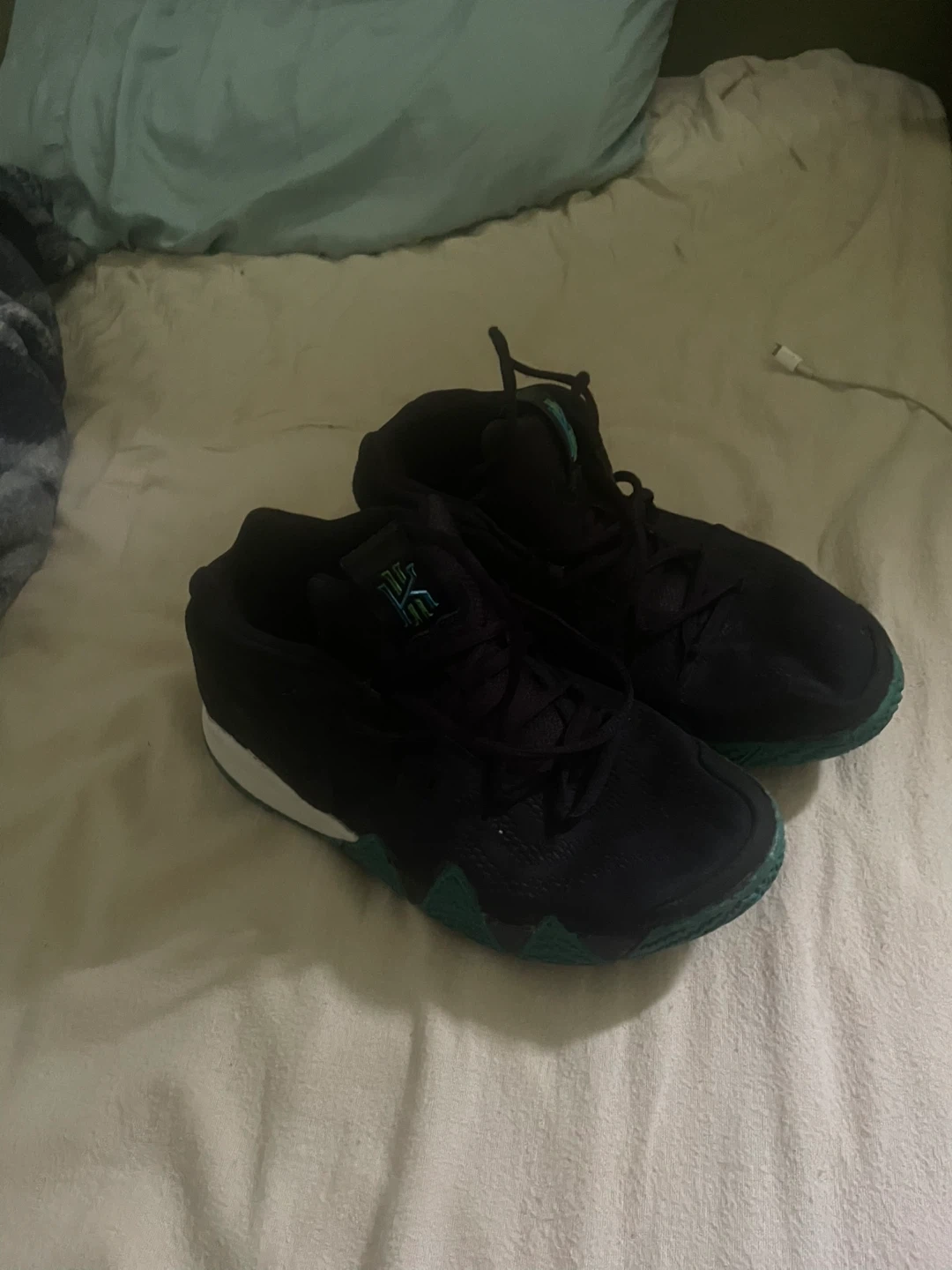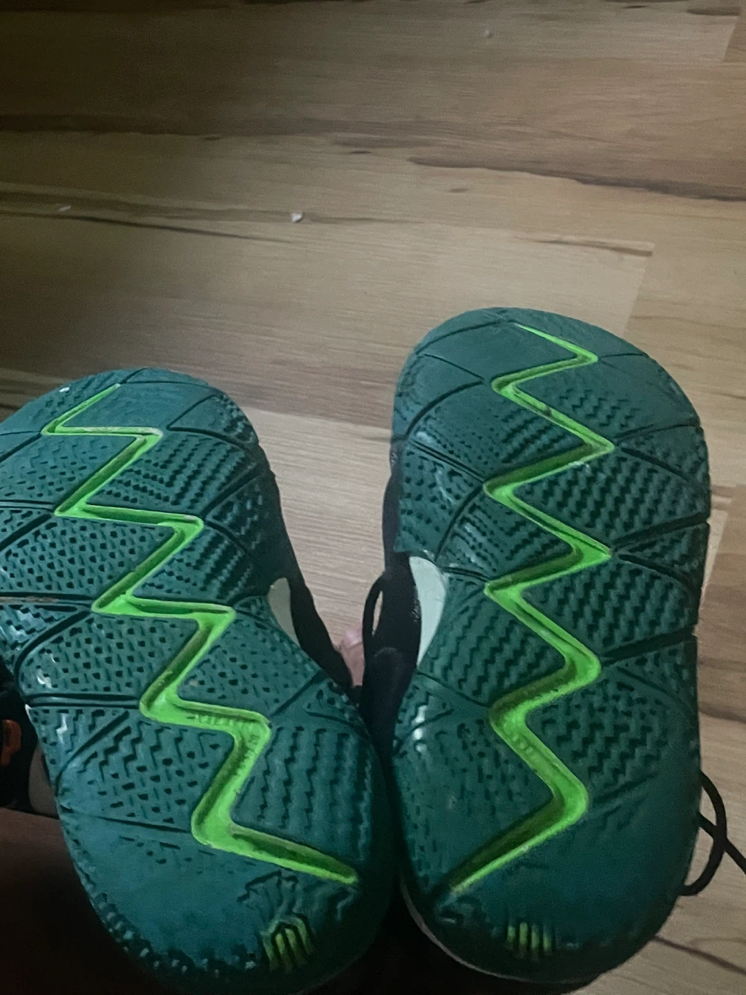 15Selling a pair of Nike Kyrie IV basketball shoes in size 8.5Y. They have a black and green color scheme, and are in good condition!