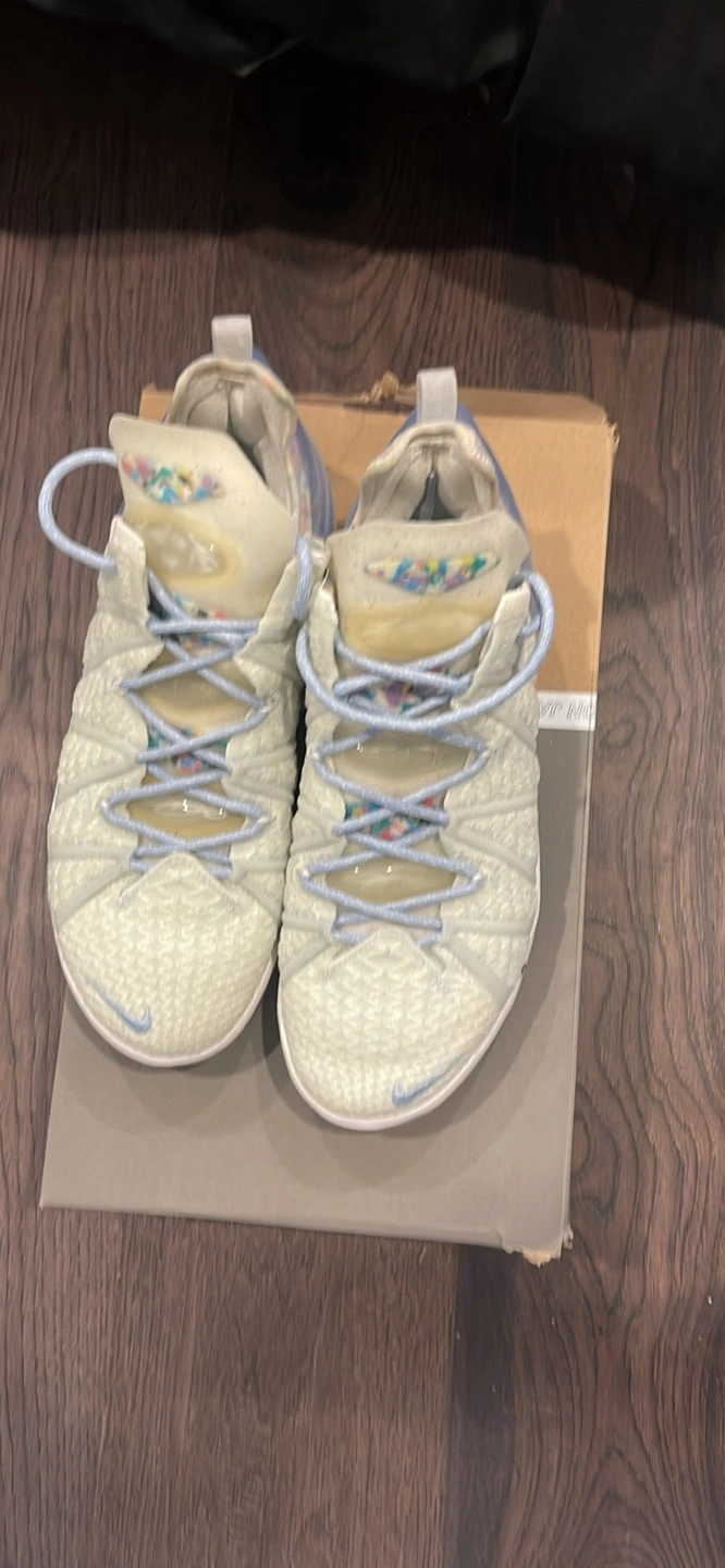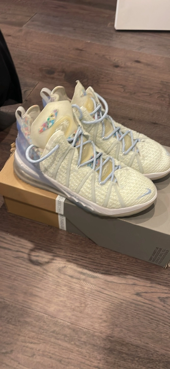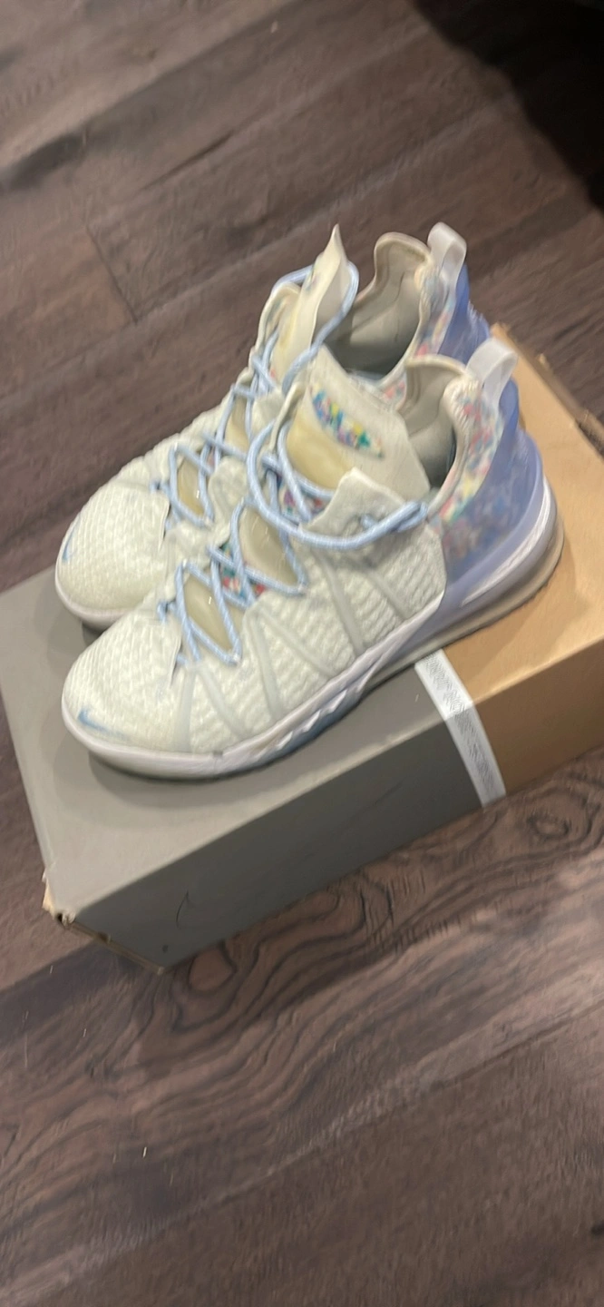 10Selling a pair of Nike LeBron 18 Low shoes in a white and blue colourway. They come with the original box. These shoes are great for basketball or casual wear. Please feel free to ask any questions!