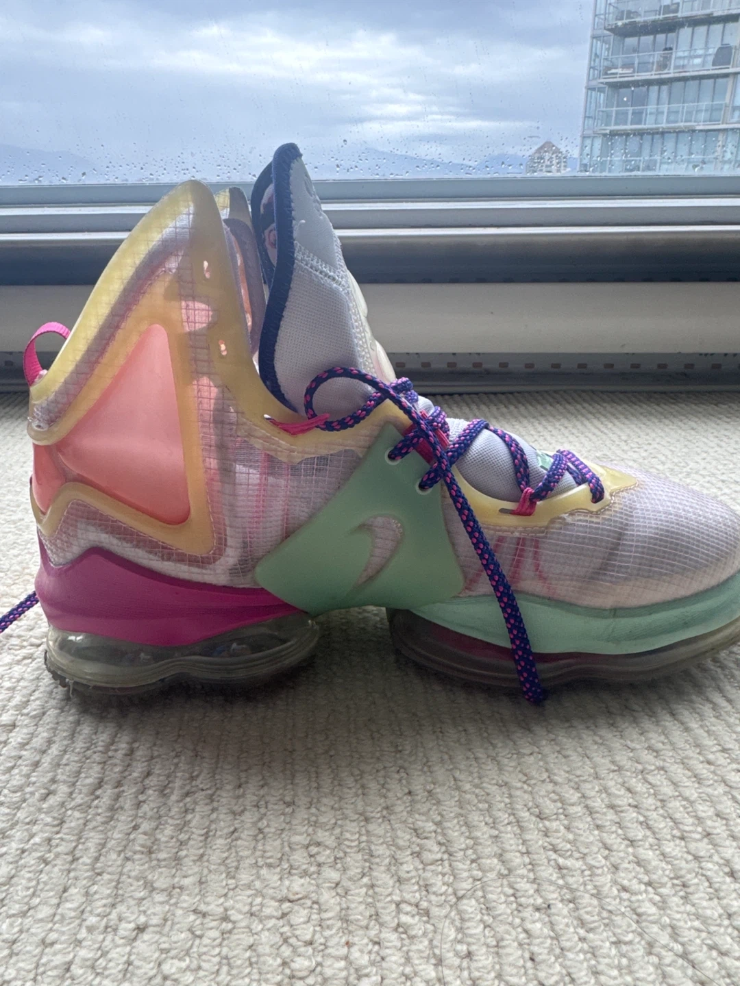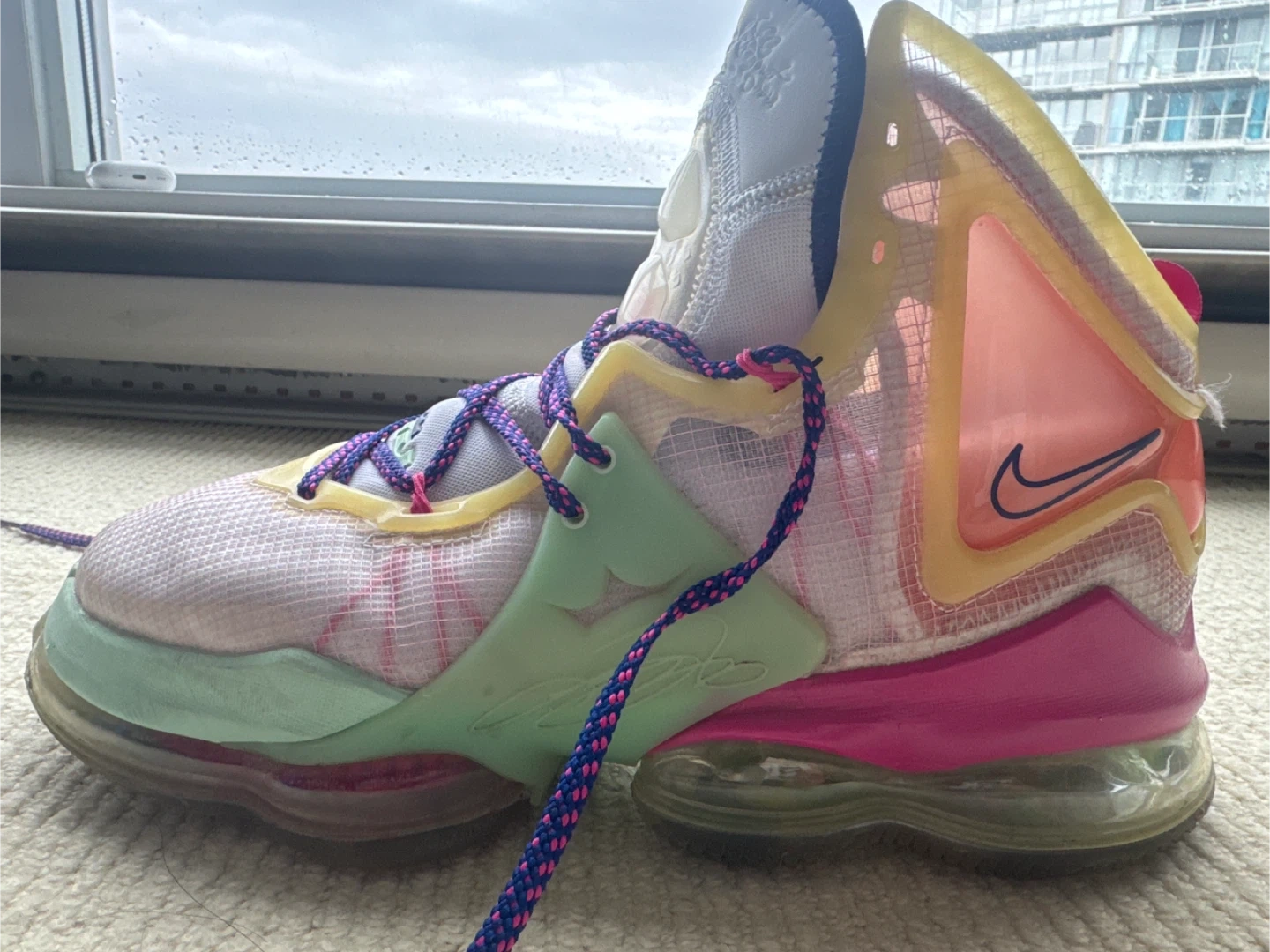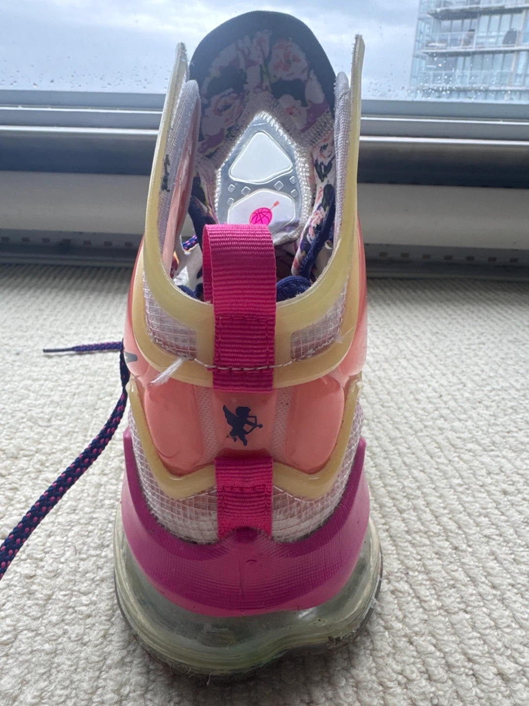 10Selling a pair of Nike LeBron 9 Low Valentines Day shoes. They feature a vibrant colour palette with pink, yellow, and mint green accents. The shoes have a unique design with visible air cushioning and decorative floral patterns inside. Perfect for adding a pop of colour to your sneaker collection