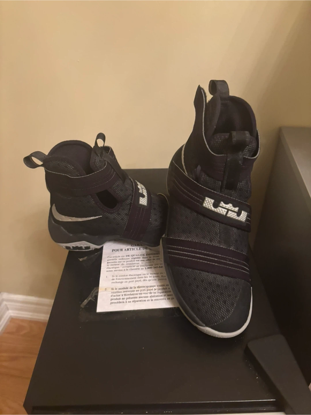 15Selling a pair of Nike LeBron Soldier 10 in black. The size is 4.5Y, which is equivalent to a US size 4.5. Great for basketball or casual wear!