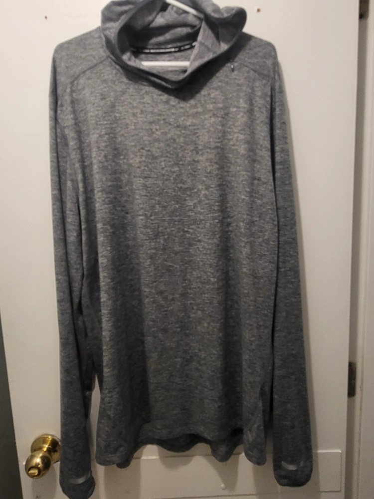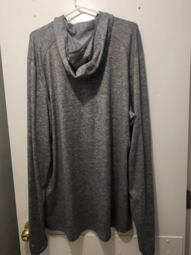 201Grey long sleeve athletic hoodie. Pullover style. Thumbholes at cuffs. Moisture-wicking material. Great for workouts or casual wear.