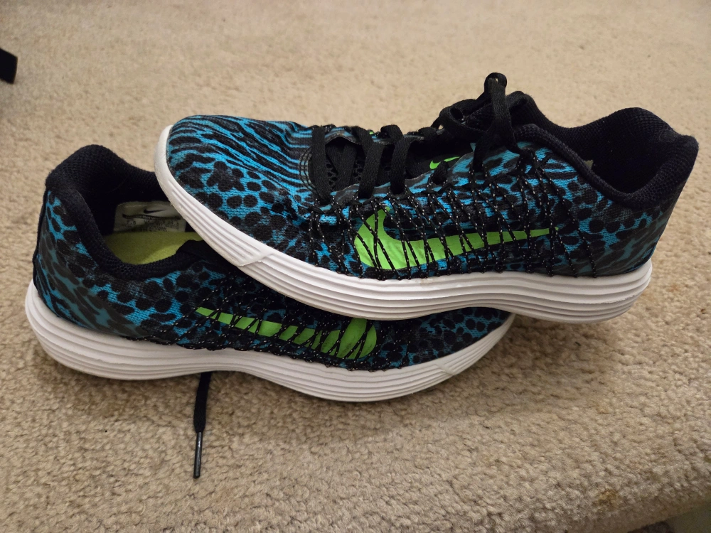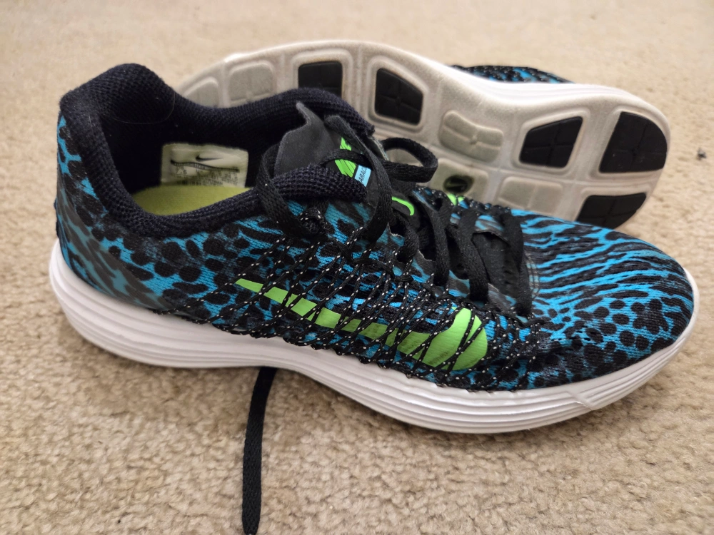Selling a pair of Nike LunarGlide 6 running shoes in size 7. They feature a unique blue and black animal print design with a vibrant green Nike swoosh. These shoes are in good condition and ready for your next run!