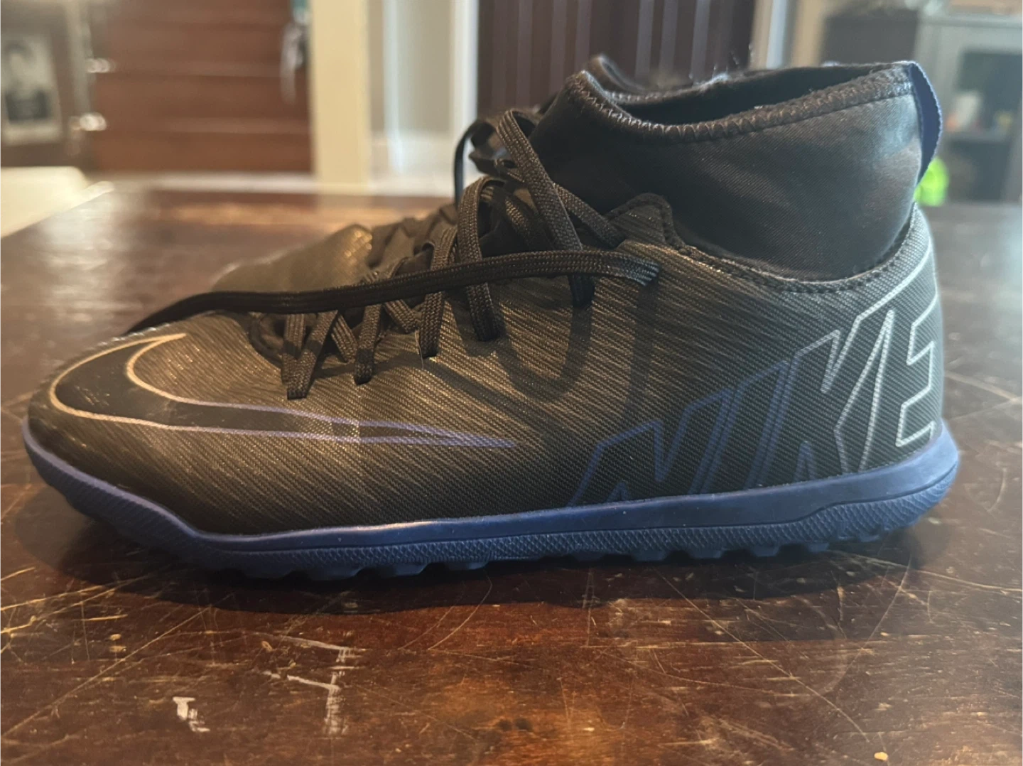 Selling a pair of Nike Mercurial soccer shoes! They are black with blue accents and in good condition. Great for playing soccer!