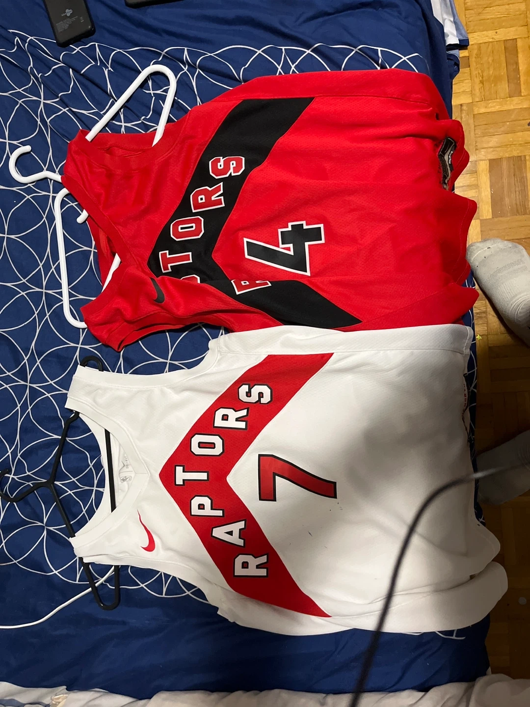 10Selling a pair of Toronto Raptors NBA jerseys! One is a Scottie Barnes #4 jersey in red, size 52. The other is a Kyle Lowry #7 jersey in white, size 48. Both are Nike Swingman jerseys with "We The North" detail. Great for any Raptors fan! Separate is 50$